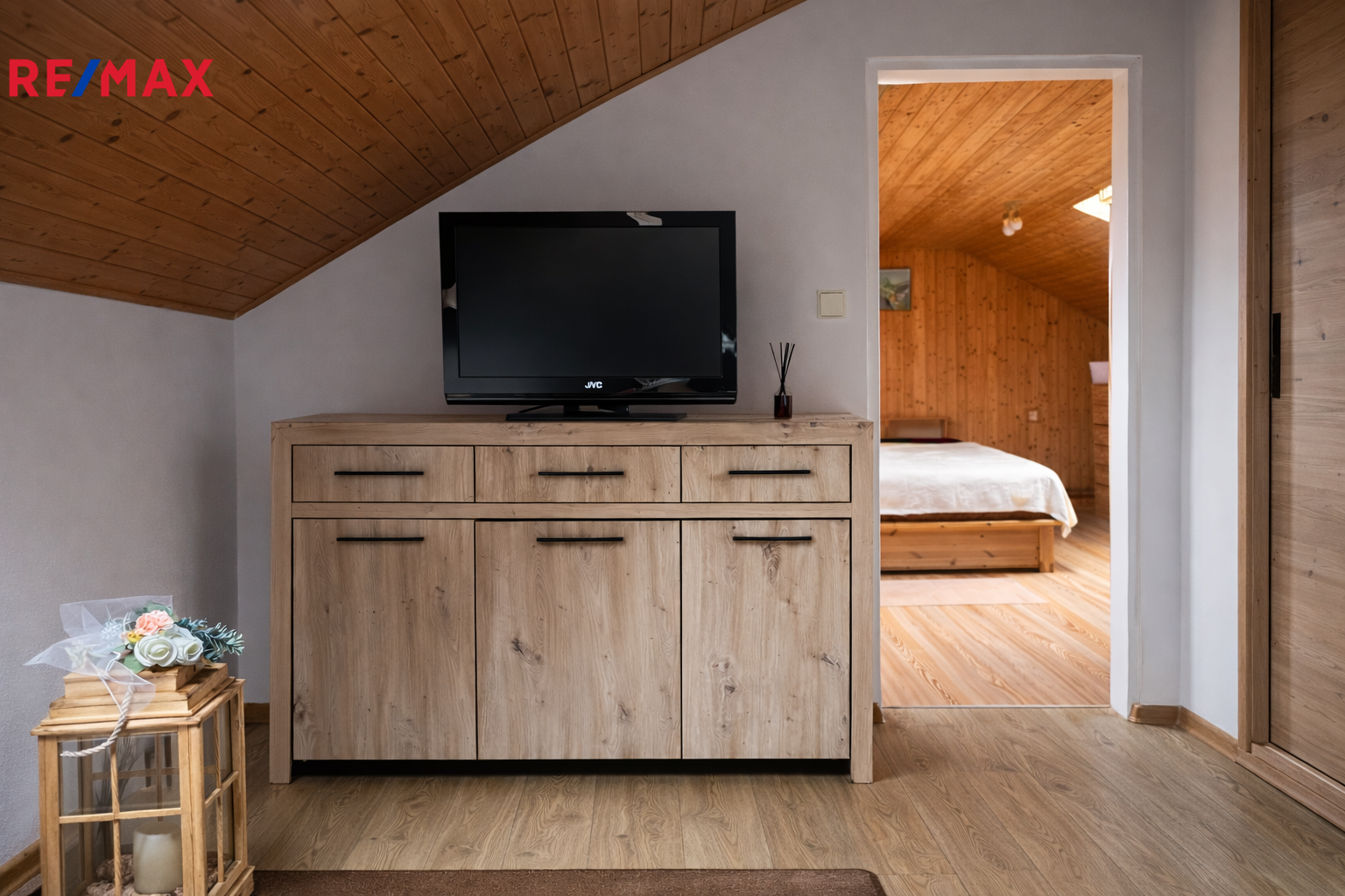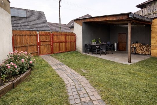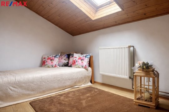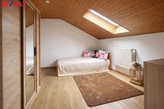 V podkroví jsou tři ložnice. Jedna aktuálně slouží jako šatna. Ústí na prostornou terasu s výhledem na okolí. Menší, velmi dobře udržovaný objekt s menší zahradou, s okrasným záhonem, a sezóním posezením pod přístřeškem.