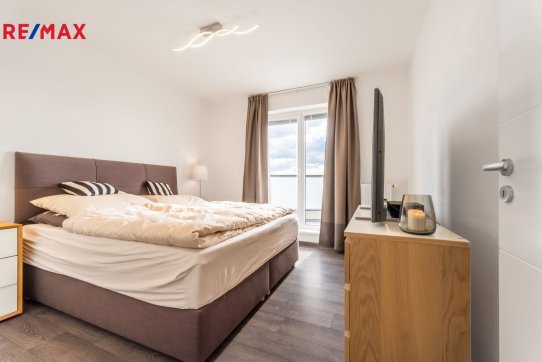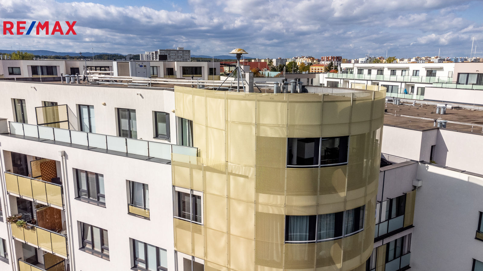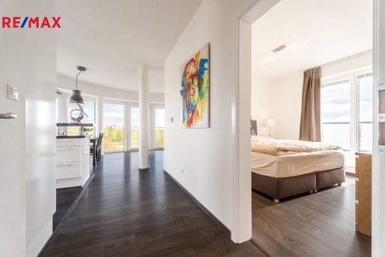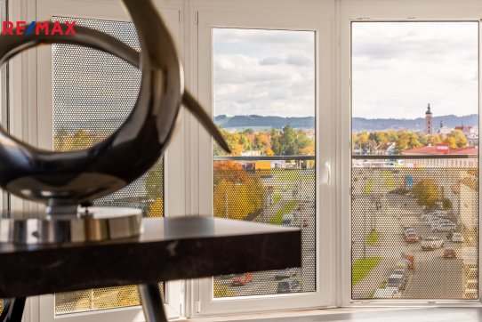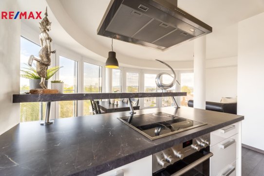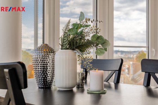 Dispozice světlého a originálně řešeného bytu s výhledem nejen na Černou věž, sestává ze vstupní chodby s navazující centrální chodbou, velkého (34 m2) východně orientovaného obývacího pokoje s navazující jídelní částí a kuchyňským koutem (kompletně vybavený spotřebiči – varná deska, elektrická trouba, myčka, lednice s mrazákem) vše s přímým vstupem na terasu. Dalšími místnostmi v jsou pokoj č.2 využívaný jako ložnice (se vstupem na druhou terasu), pokoj č.3 s variabilní možností využití (dětský pokoj, pracovna, aj.), koupelna s umyvadlem, vanou a sprchovou nikou a samostatné WC. Odkaz na virtuální prohlídku bytu: https://my.matterport.com/show/?m=ctfpc1SUAGF