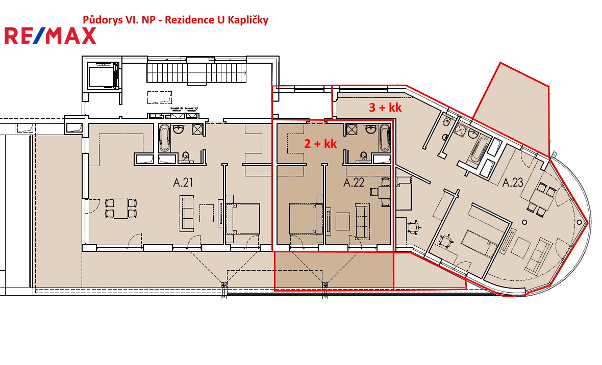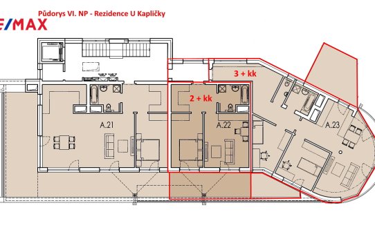 První z bytů má dispozici 3+kk, užitnou plochu 104 m2 (+ 2 garážová stání) a je situovaný v 5.patře bytového domu Rezidence U Kapličky, na adrese Sukova 1828/2, České Budějovice.