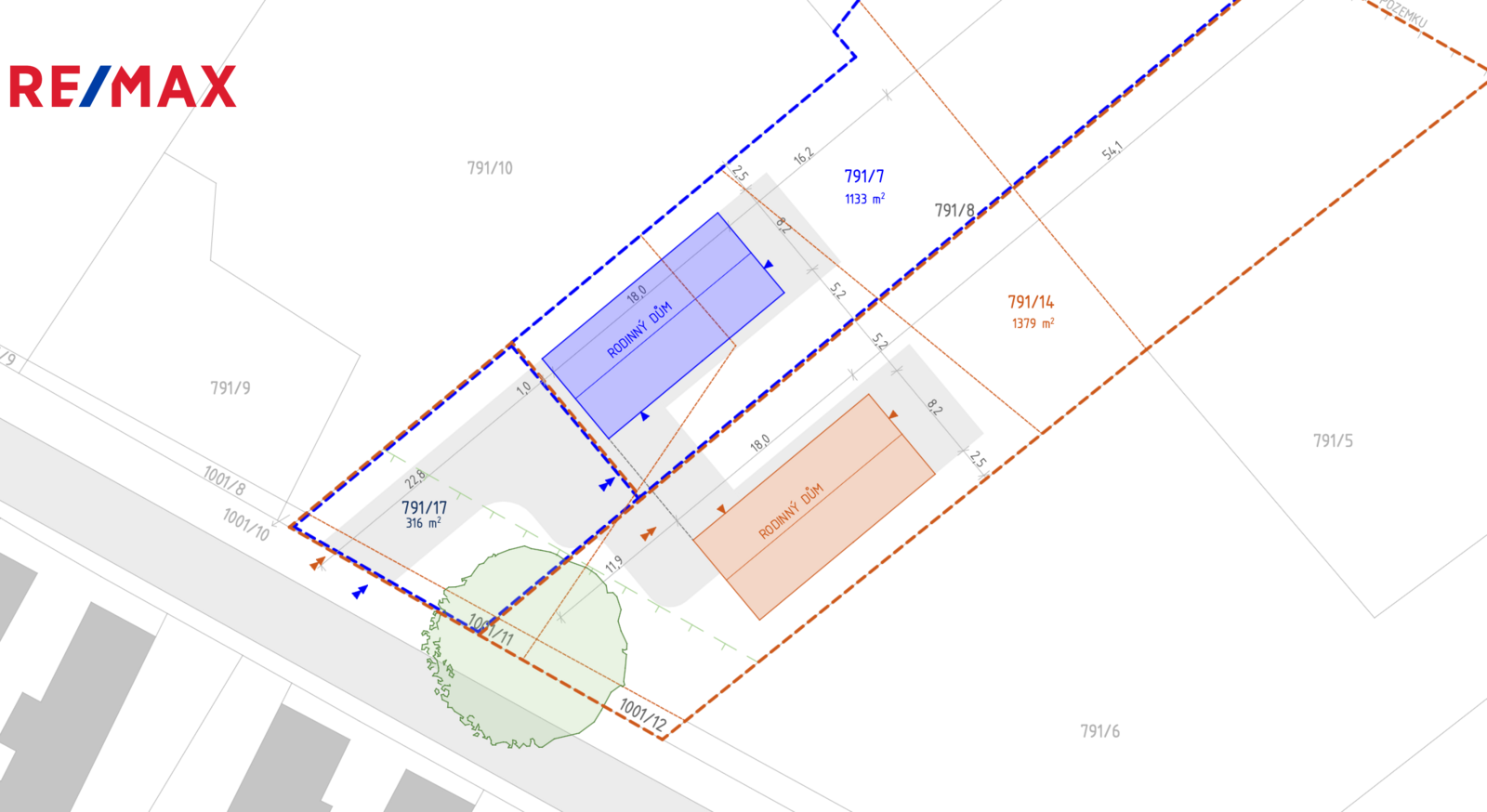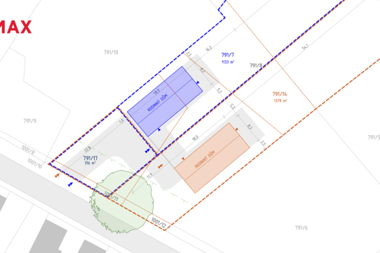 Ve fotogalerii najdete i geometrický plán s možností umístění samostatných domů na nabízeném pozemku a vedlejším pozemku parc. č. 791/7, který byl prodán na konci loňského roku.