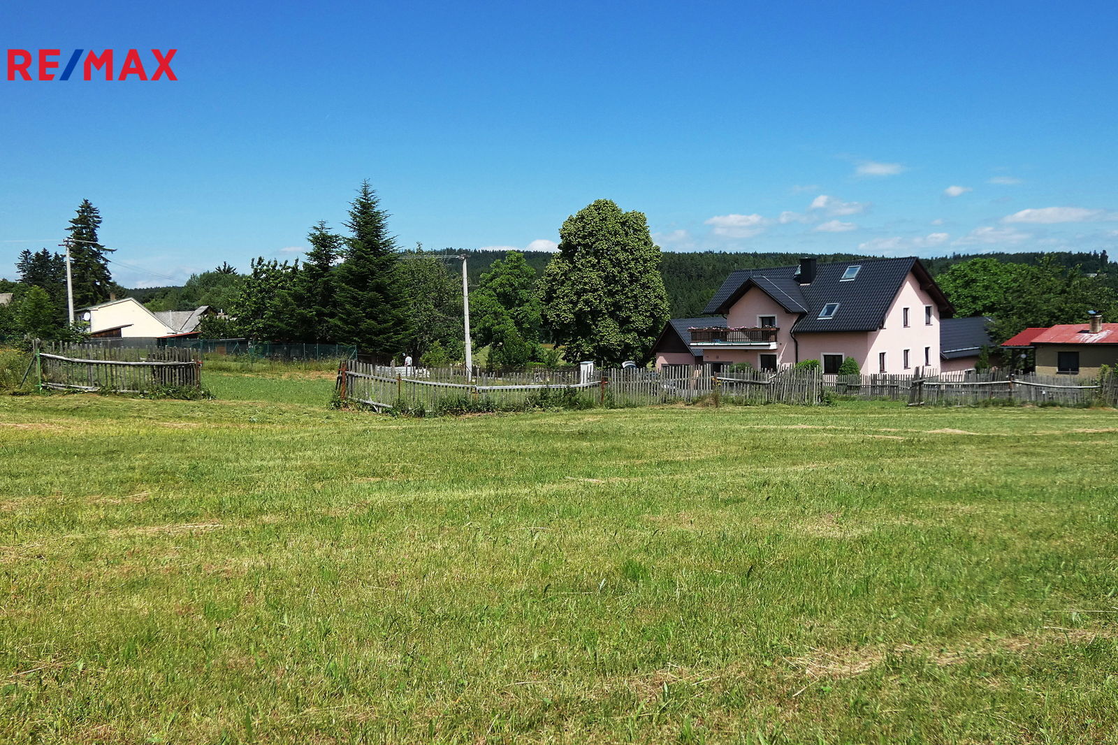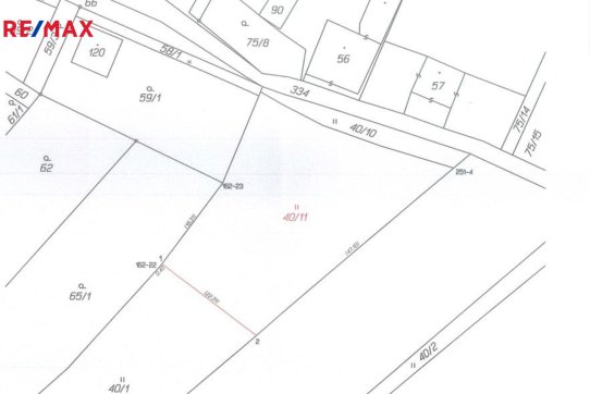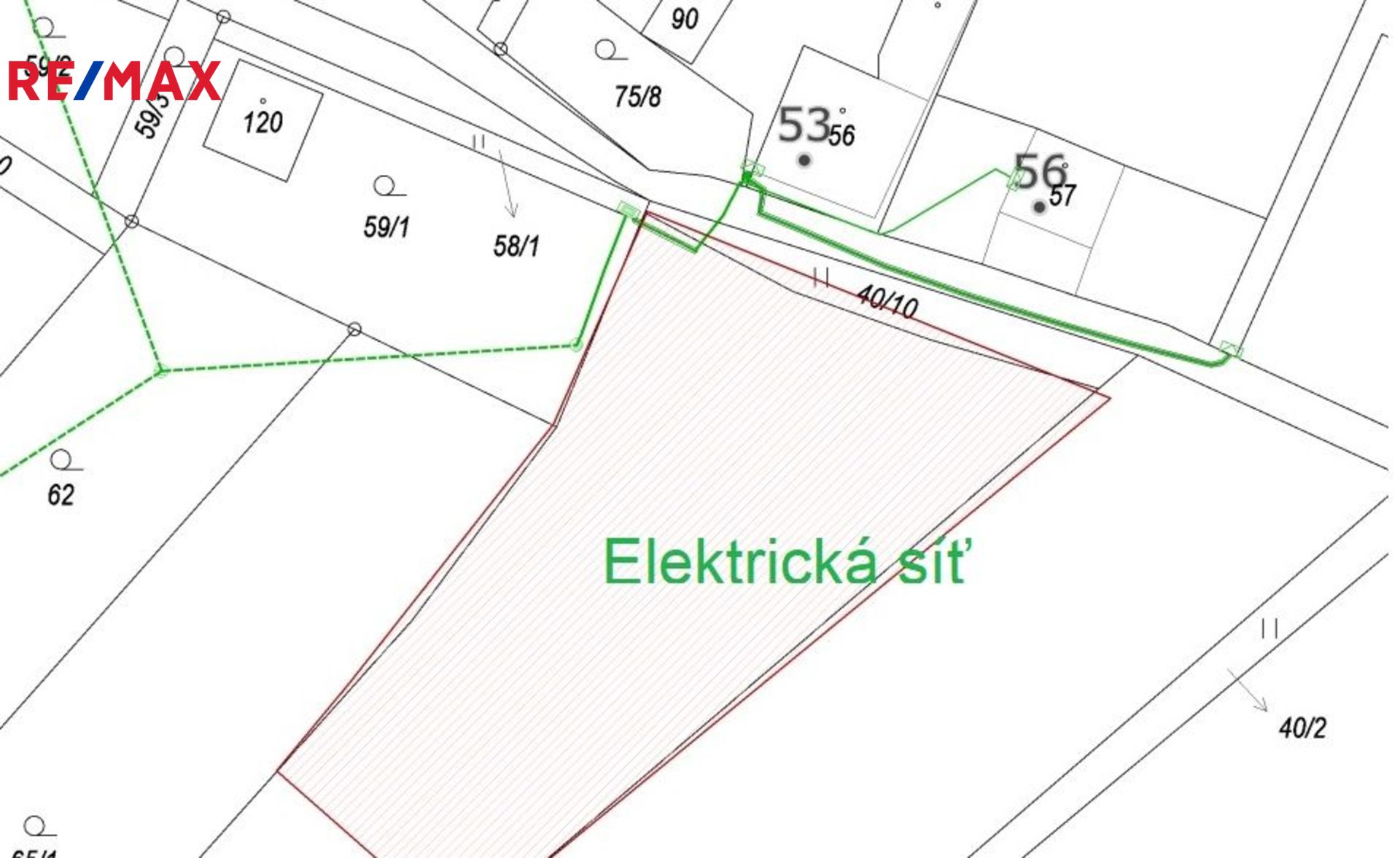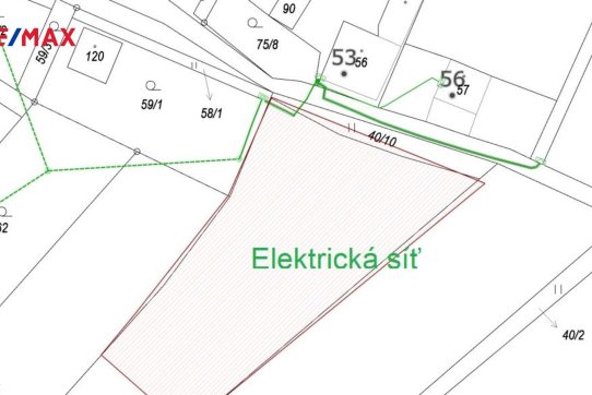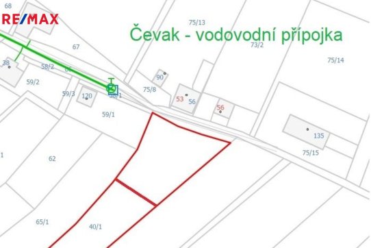 Elektrické vedení prochází okrajem pozemku a obecní vodovod je vzdálen cca 22 m od hranice pozemku. Viz. obrazová příloha inzerce.