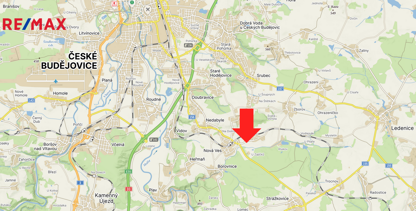 Autem se do Českých Budějovic dostanete během pár minut. Zastávka autobusu je od pozemku vzdálená asi 750 m. Vlaková zastávka je podobně daleko.