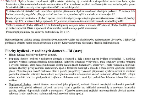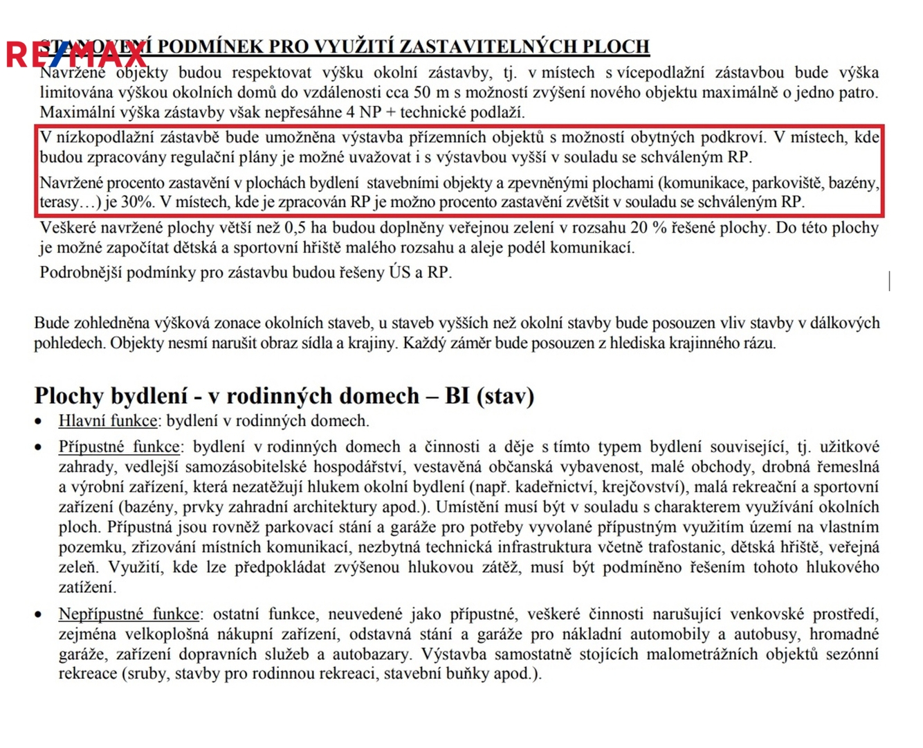 Celková výměra pozemku je 1664 m2, z toho cca 690 m2 je zařazeno územním plánem do plochy bydlení v rodinných domech. Povolen je jednopodlažní rodinný dům s obytným podkrovím. Zastavitelnost pozemku max. 30%. Podrobnější informace z územního plánu najdete ve fotogalerii. Pozemek je aktuálně propachtován. Pachtovní smlouvu je možno ukončit dohodou po sklizni cca v srpnu.