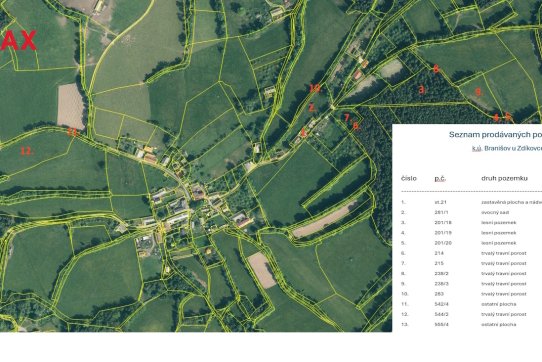 Předmětem prodeje je celkem 34.300 m2 pozemků na nichž se nachází vlastní objekt k bydlení ve funkčním celku se stodolou a navazující zahradou (celkem 5.200 m2), další pozemky - louky (20.300 m2) a lesy (8.800 m2).