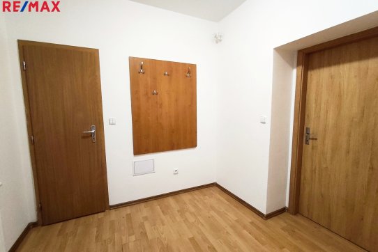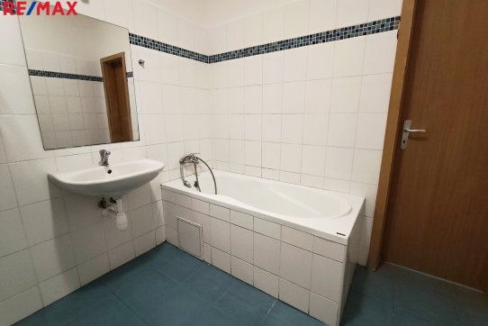 Koupelna je osazena vanou a umyvadlem, WC a přípojným místem pro automatickou pračku. V předsíni je umístěna věšáková stěna.
