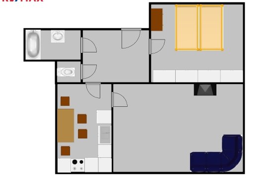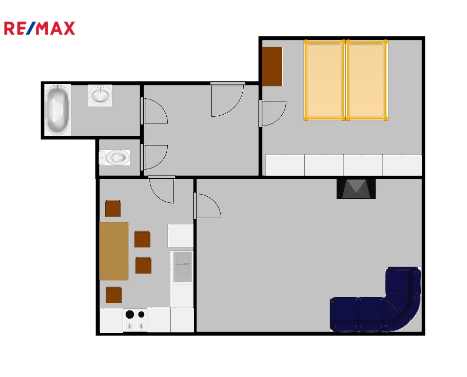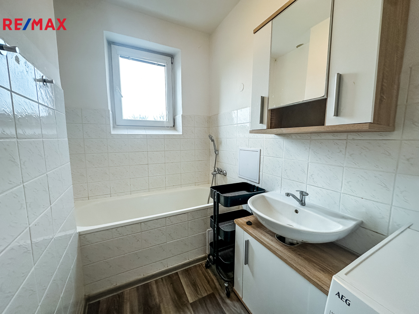 Dispozice zahrnuje předsíň, samostatnou ložnici s prostornou skříní, obývací pokoj, kuchyň s jídelním koutem, koupelnu s vanou a oddělené WC. Díky praktickému uspořádání působí byt vzdušně a příjemně.