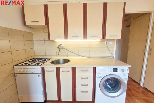 Prostorově je byt řešen: předsíň (2 m2) a dvě místnosti – obytná kuchyň (14,5 m2) a pokoj s balkonem (16,2 m2). Koupelna (3,5 m2)s kratší vanou a WC jsou nové, podlaha dlažba. Jádro je s novými obklady, kuchyně pokrytá linoleem, v pokoji parkety.