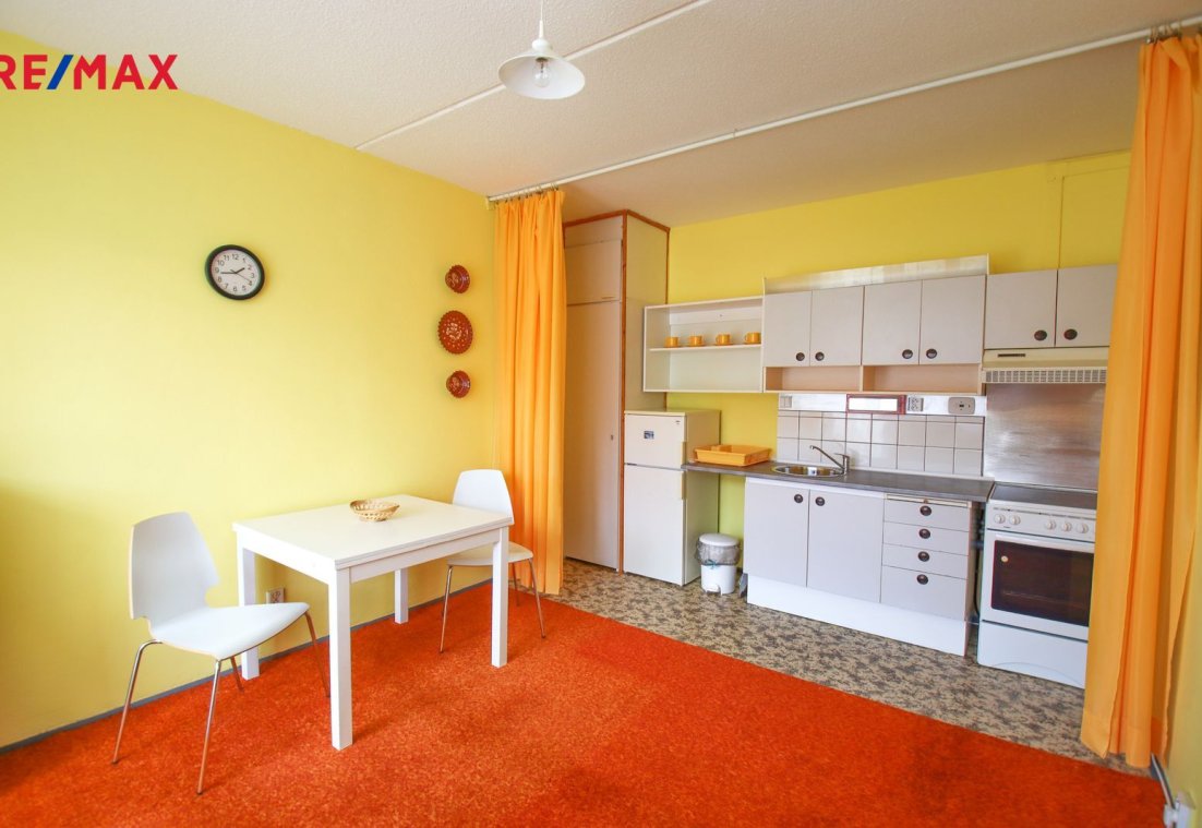 Kuchyňská linka je vybavena spotřebiči (elektrická trouba se sporákem, digestoř, dřez, lednice s mrazákem). Ložnice i obývací pokoj jsou orientovány na západ.