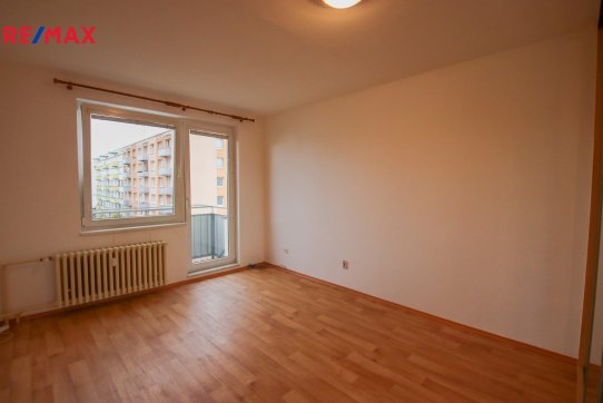 V obývacím pokoji je kuchyňská linka s plynovým sporákem, digestoří a dřezem. Z obývacího pokoje posuvnými dveřmi projdeme do ložnice ze které je vstup na balkon.