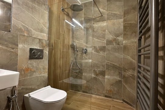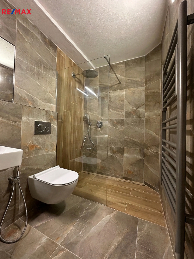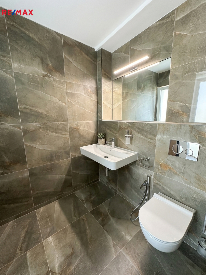 Naprostou výhodou je praktické řešení koupelny, do které se vstupuje z hlavního obytného prostoru naproti kuchyňské lince. Koupelna je moderně řešená a vybavena luxusní hlavovou sprchou Grohe Rainshower s přídavnou masážní tryskou. Ohřev vody zajišťuje chytrý bojler s funkcí samoučení, který optimalizuje spotřebu podle vašich potřeb. Celý interiér působí velmi světlým a vzdušným dojmem.