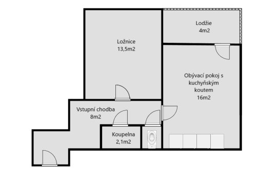 Dispozice bytu zahrnuje vstupní chodbu, koupelnu, samostatné WC, ložnici a obývací pokoj s kuchyňským koutem. Z obývacího pokoje je vstup na prostornou lodžii. K bytu náleží sklepní kóje, která poskytuje další úložný prostor. Byt je vhodný pro jednotlivce nebo pár, případně pár s malým dítětem.