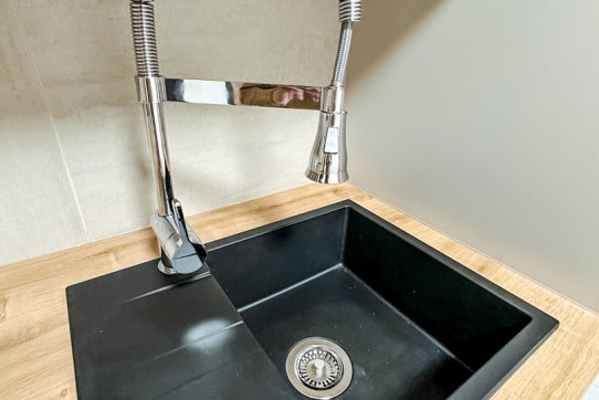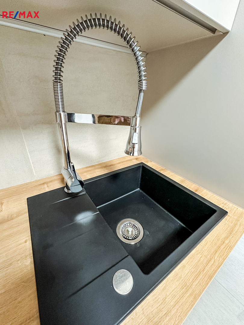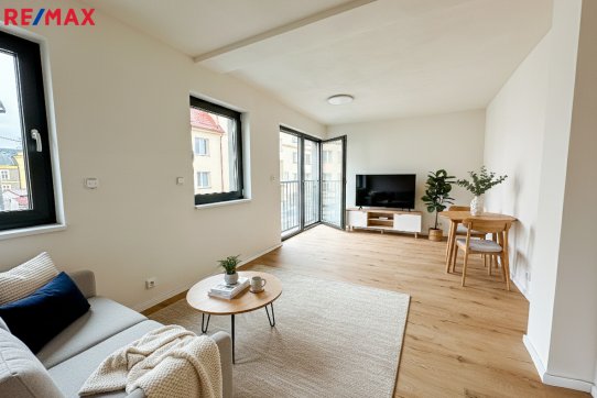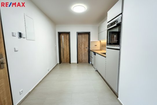 Dispozice bytu je prakticky členěná. Vstupními dveřmi vejdete přímo do hlavního prostoru s kuchyňským koutem, který nabízí dostatek místa pro jídelní stůl. Po pravé straně se nachází obývací pokoj, kterému dominuje francouzské okno zajišťující dostatek denního světla. V levé části bytu se nachází moderně řešená koupelna. Ta je vybavena luxusní hlavovou sprchou Grohe Rainshower s přídavnou masážní tryskou. Ohřev vody zajišťuje chytrý bojler s funkcí samoučení, který optimalizuje spotřebu podle vašich potřeb. Vedle koupelny je vstup do ložnice, ze které je přístup na balkón orientovaný do klidné zahrady. Celý interiér působí velmi světlým a vzdušným dojmem.