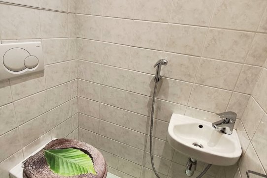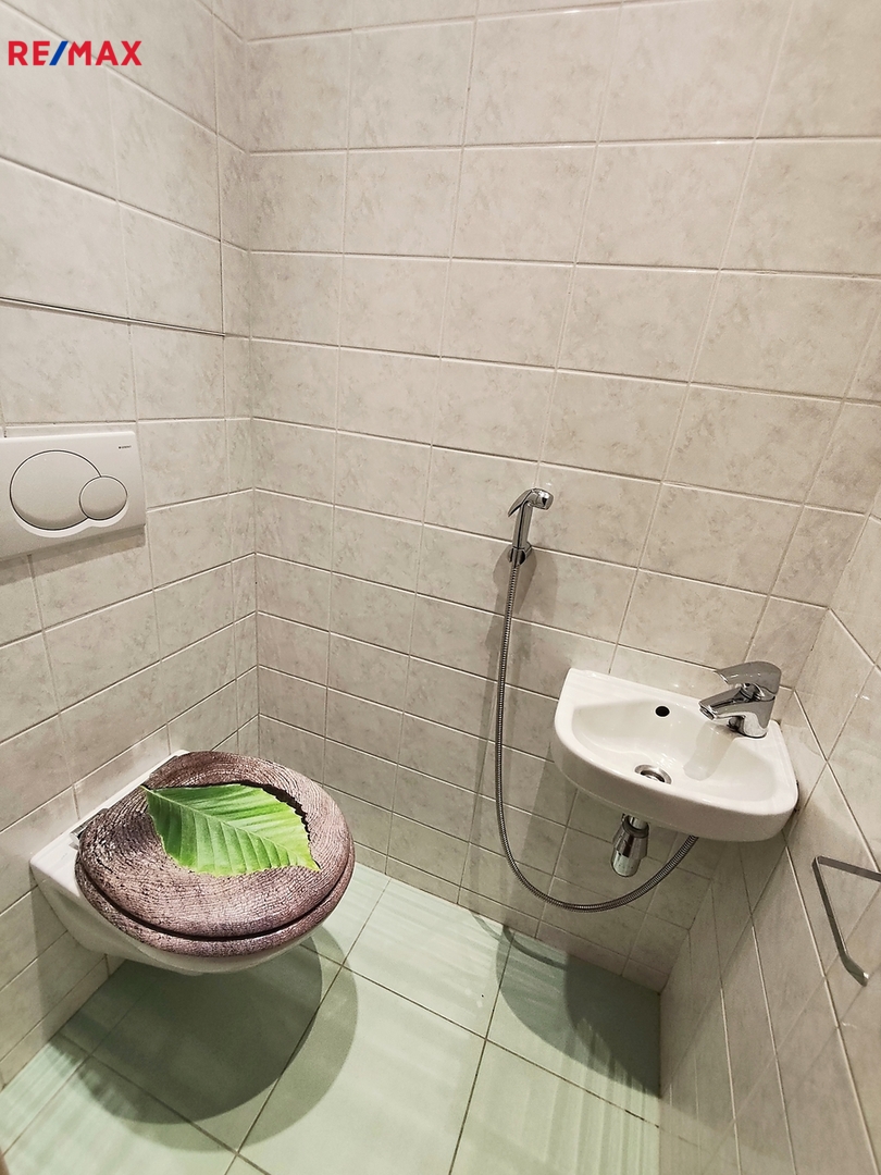 Samostatné WC je osazeno závěsným záchodem, malým umyvadlem a bidetovou sprškou.