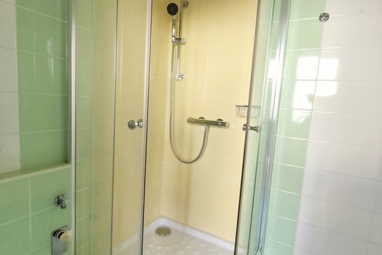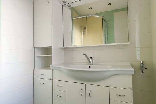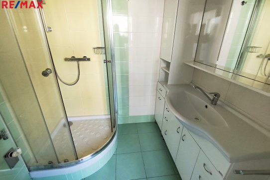 Koupelna je osazena sprchovým koutem, koupelnovým nábytkem se zabudovaným umyvadlem a zrcadlem a je zde také přípojné místo na pračku.