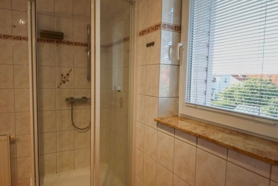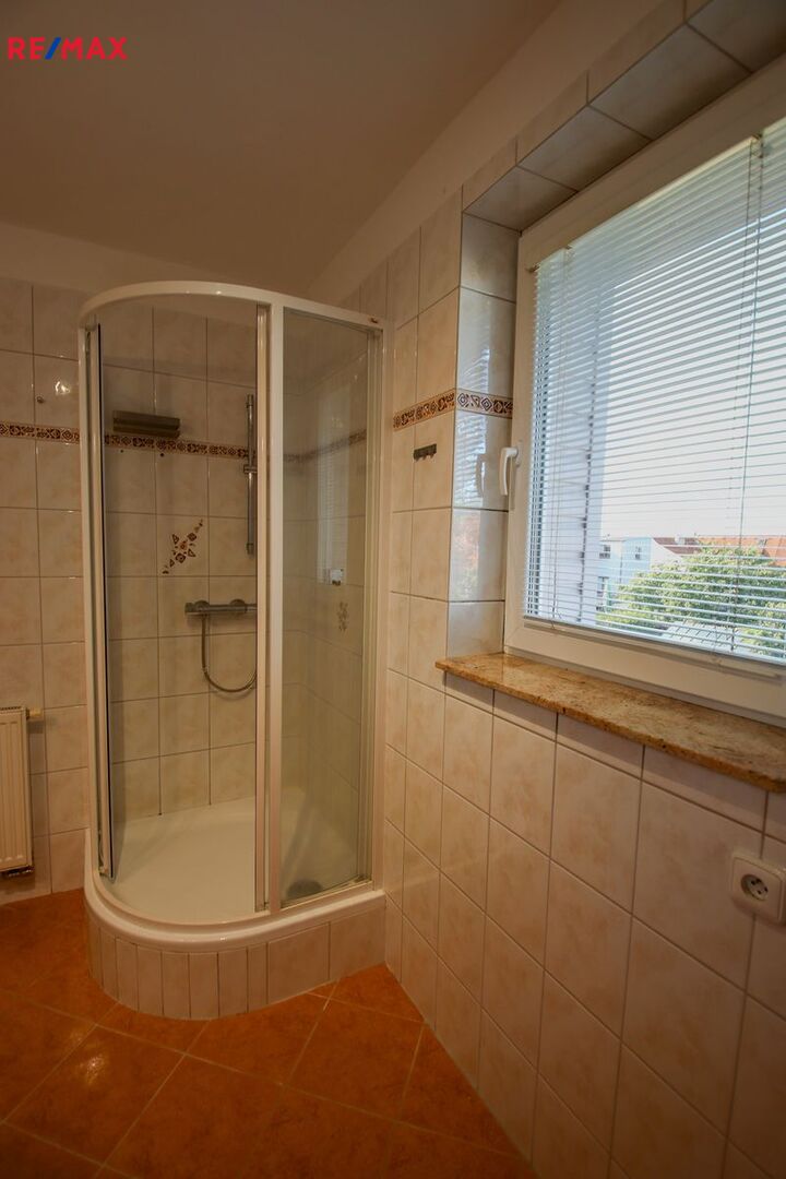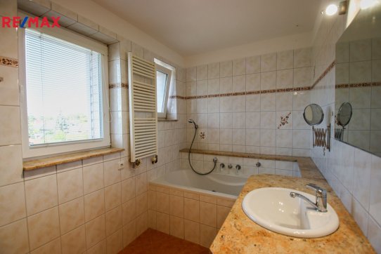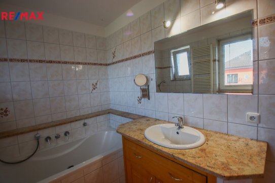 Koupelna (6 m2) s vanou, sprchovým koutem, umyvadlem se skříňkou.