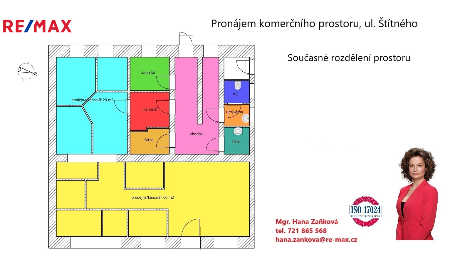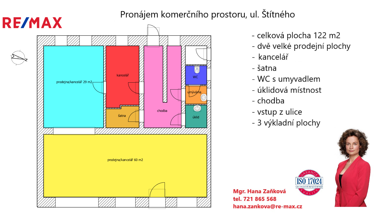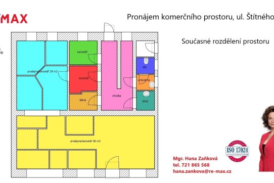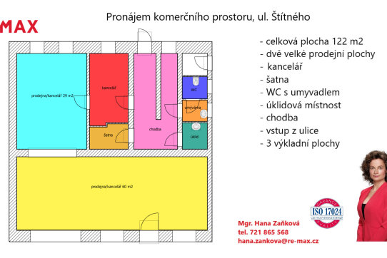 Do hlavní části obchodního prostoru o ploše 60 m2 je vchod z ulice Štítného a má tři velké výkladní skříně o celkové ploše 14 m2 orientované na východ.