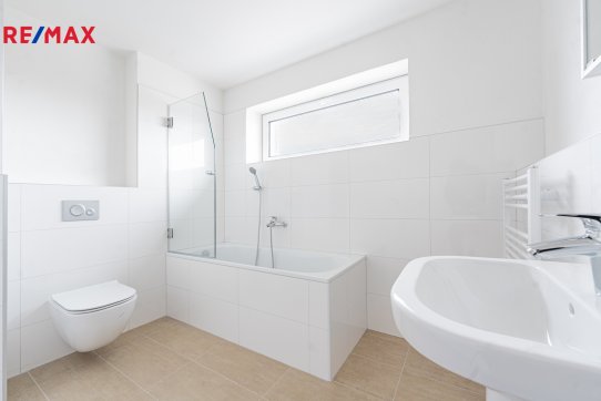 Milovníci horkých koupelí jistě ocení vanu v koupelně. Koupelna je v neutrálních barvách a nabízí dostatek prostoru i pro pračku.