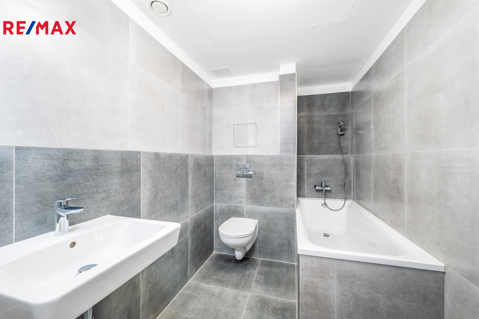 Moderní a vkusná koupelna je plně vybavena. Naproti koupelně je praktický sklad, kam se krásně schová pračka se sušičkou a další vybavení, které tak nebude zabírat místo v obytných místnostech.