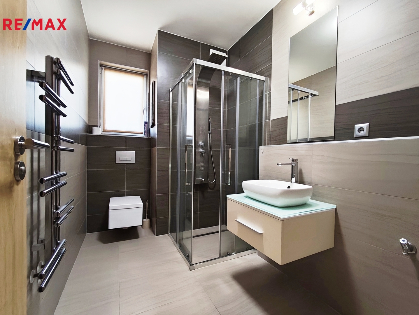 Koupelna je osazena sprchovým koutem, závěsným WC, umyvadlem se zrcadlem a přípojným místem na automatickou pračku.