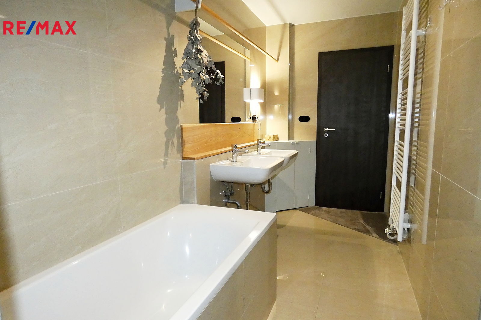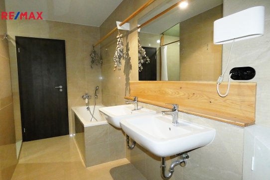 Vybavení bytu: Obytná kuchyně - kuch. linka, elektrická trouba, elektrická varná deska, myčka, digestoř, menší lednice s mrazákem; Koupelna - vana, sprchový kout, dvě umyvadla, WC a přípojné místo na pračku; Přesíň - soustava skříní. V celém bytě jsou položeny kvalitní podlahové koberce.