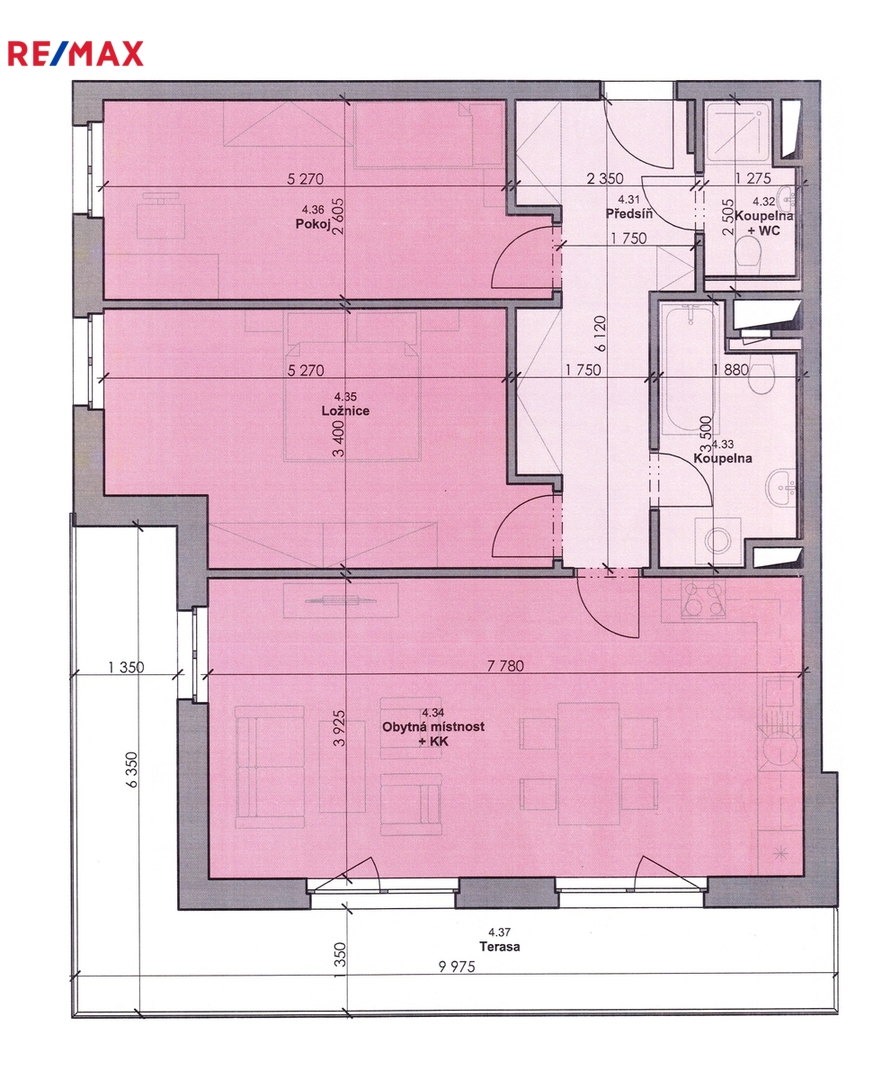 Byt se skládá z obytné kuchyně (30,5 m2), která je vybavena rohovou kuchyňskou linkou včetně nových spotřebičů Candy - indukční varná deska, elektrická multifunkční trouba, myčka nádobí, mikrovlnná trouba, digestoř Candy a z této místnosti je výstup na velkou terasu. Dále dvou ložnic (17,3 a 14,3 m2), dvou koupelen s WC (5,4 a 2,5 m2) a velké předsíně o výměře 10,6 m2.