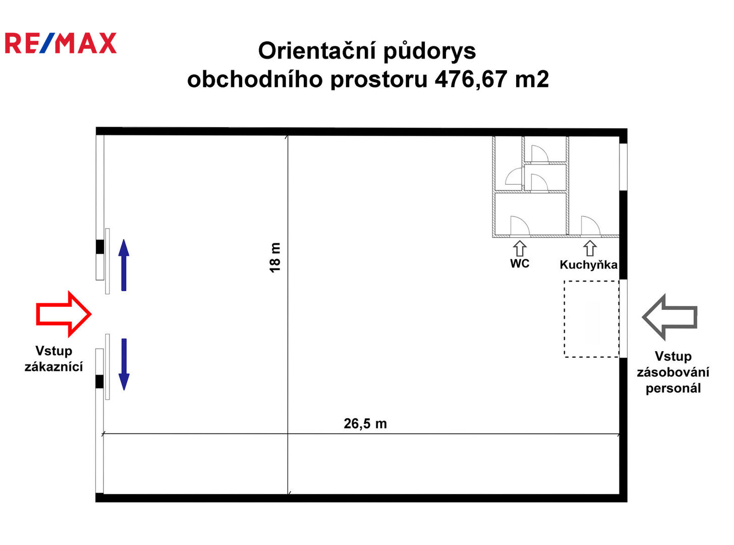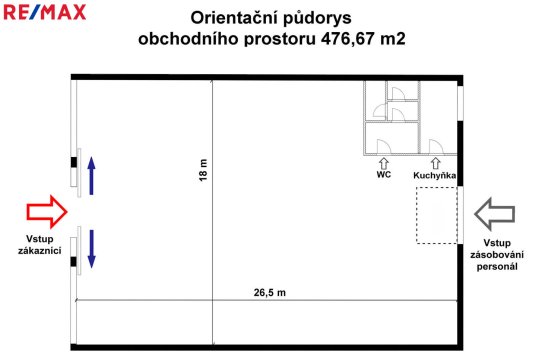 V obchodním prostoru je možné vybudovat libovolné rozdělující příčky pro prodejní část, kancelář, sklad či jiné technické zázemí a dotvořit si tak obchod dle svých potřeb.