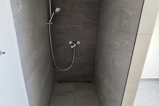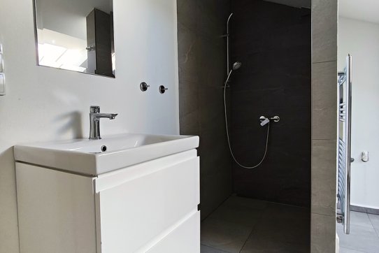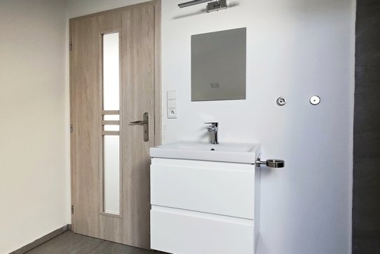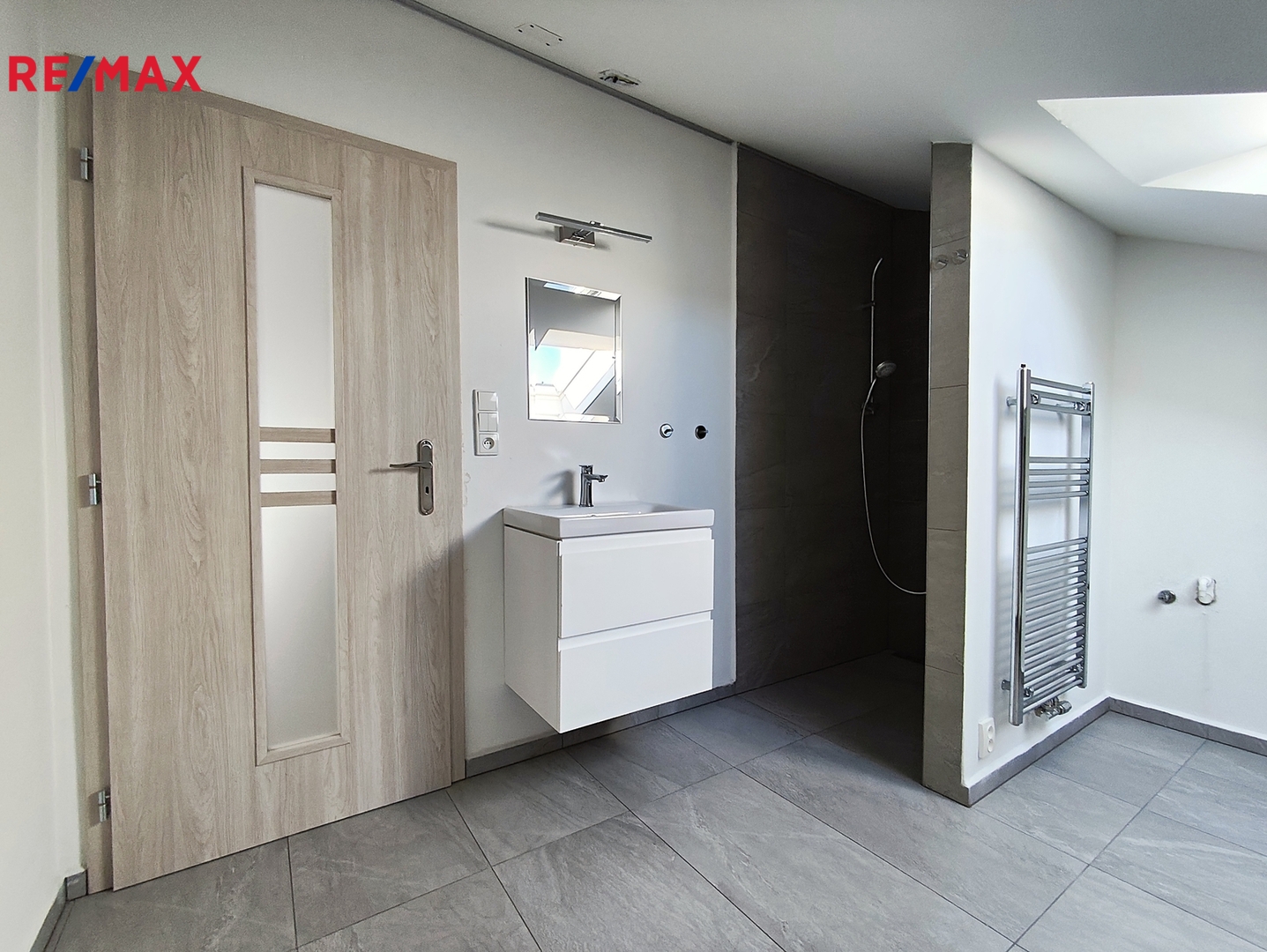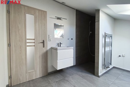 Koupelna je prostorná, spojená s WC, vybavena sprchovým koutem, umyvadlem, závěsným WC, otopným žebříkem a zrcadlem.