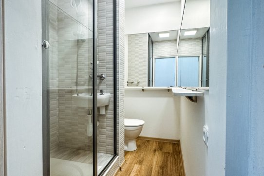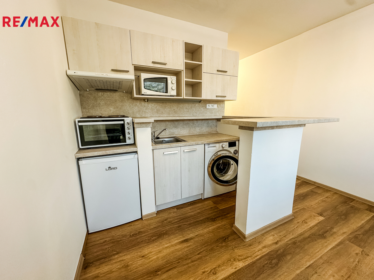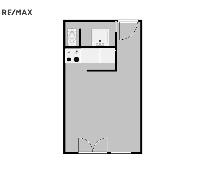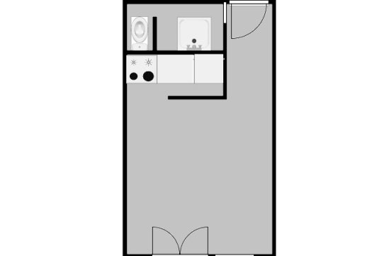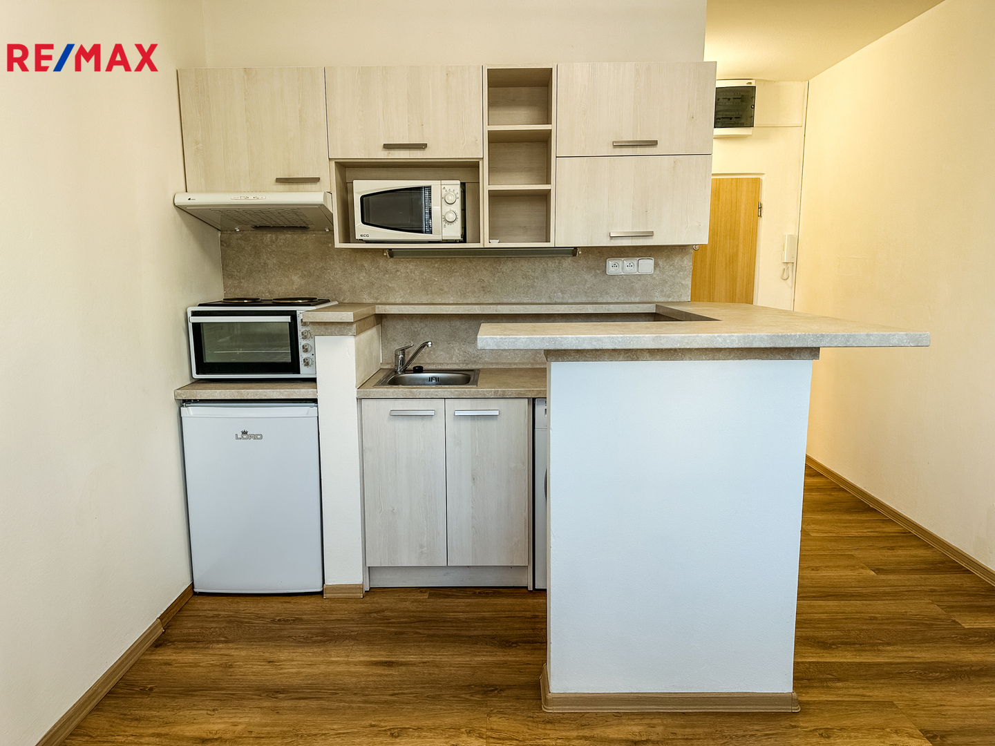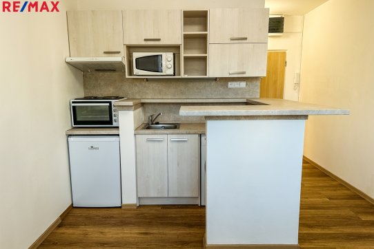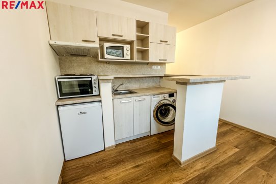 Dispozice bytu zahrnuje vstupní chodbu, koupelnu se sprchovým koutem a toaletou, a obývací místnost s moderní kuchyňskou linkou vybavenou elektrickou troubou a varnou deskou.
