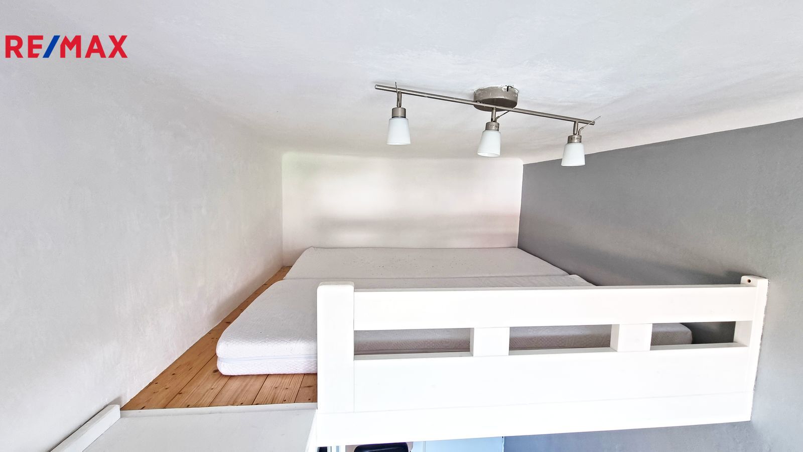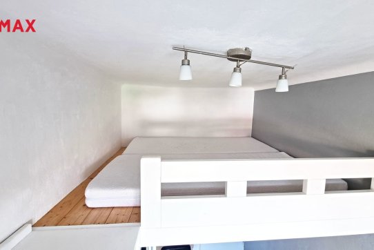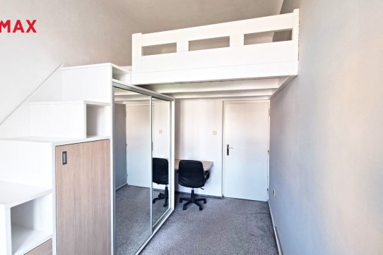 V pokoji se díky vysokému stropu nachází vyvýšený prostor na spaní, pod který se ještě vešel pracovní stůl. Výhodou tohoto řešení je dostatek úložného prostoru.