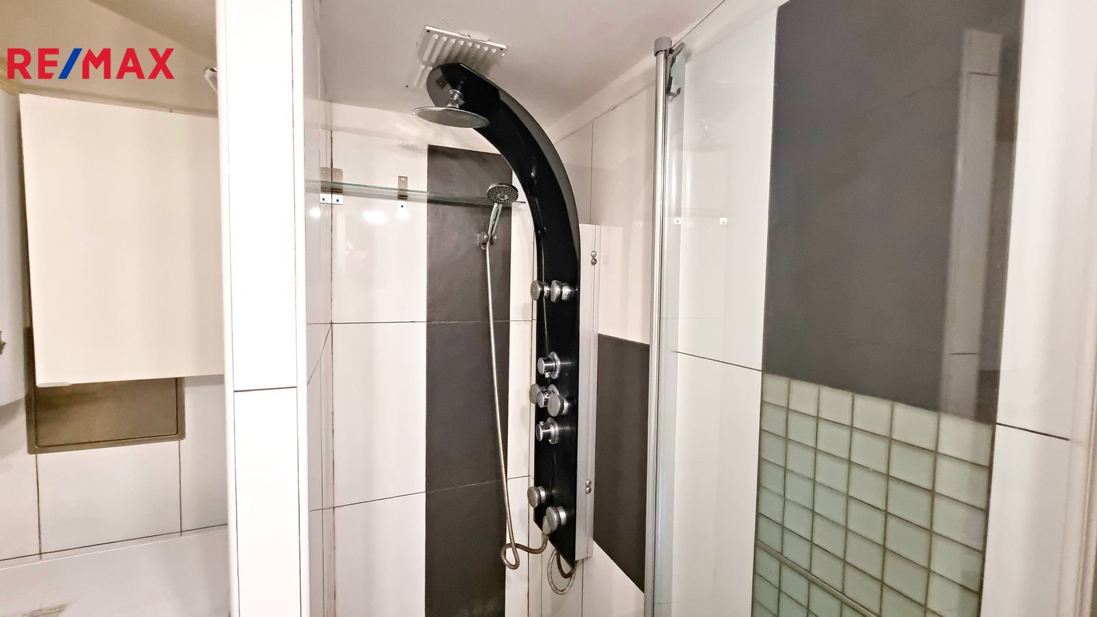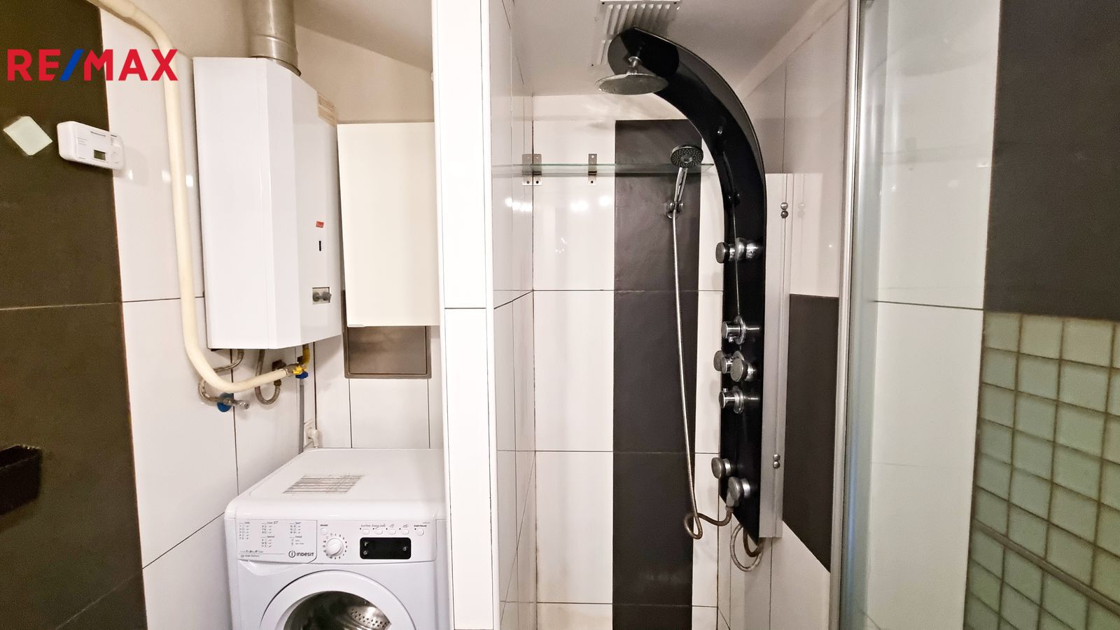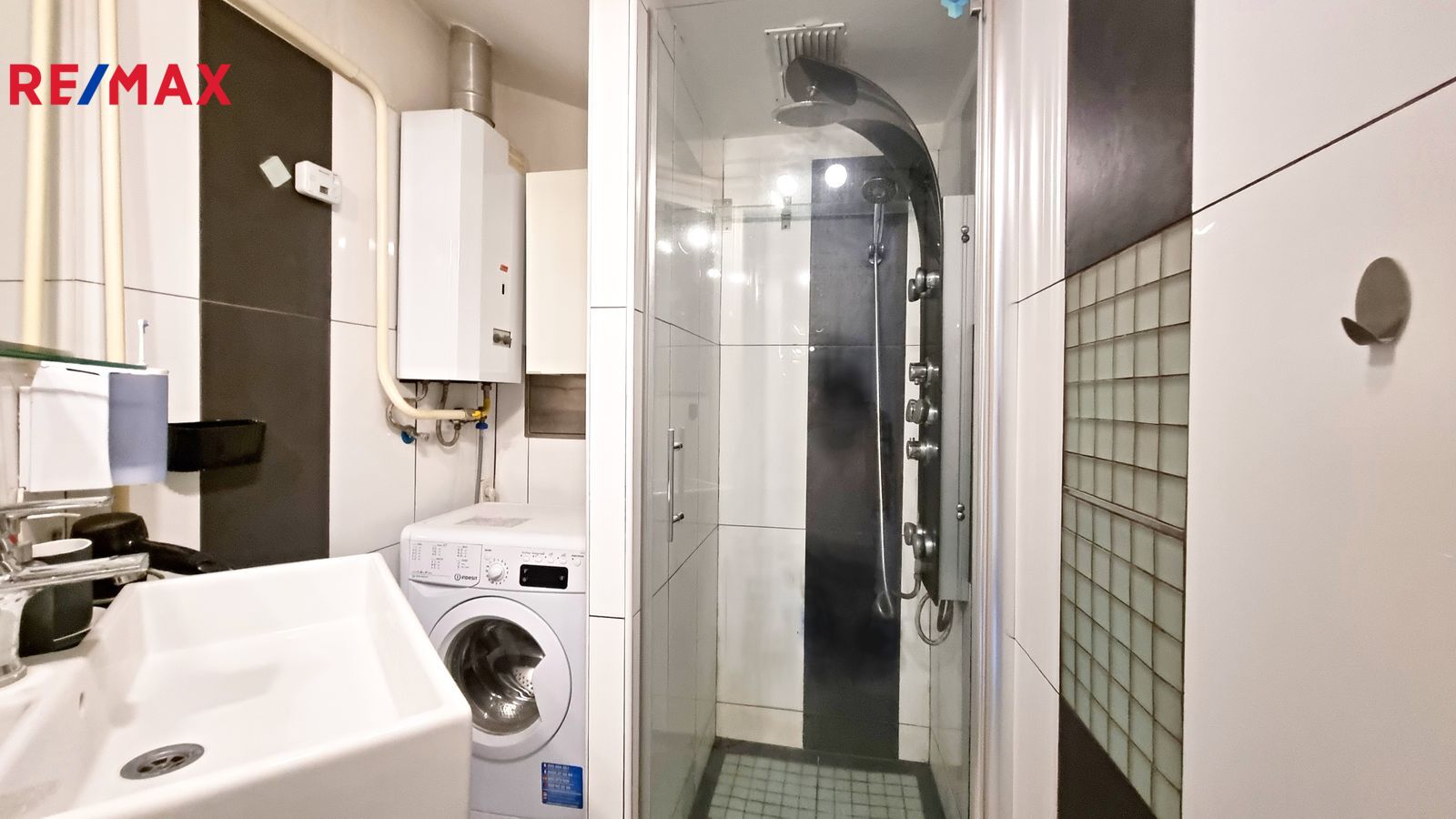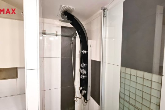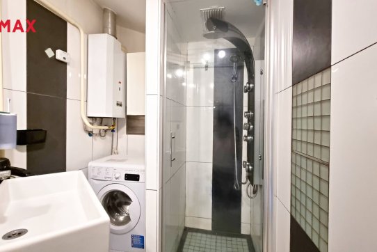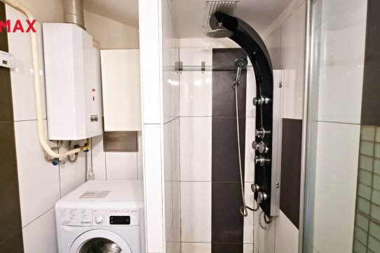 V koupelně je pračka a plynový ohřívač vody. Vyzdvihnout je třeba sprchový kout s masážními hlavicemi.