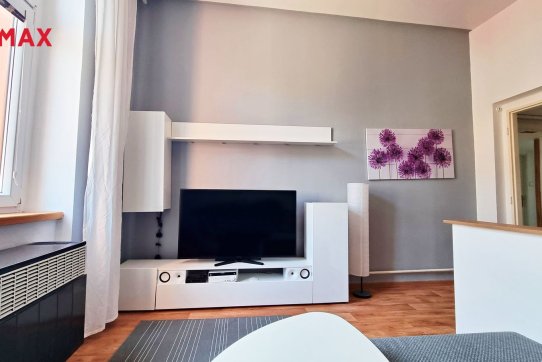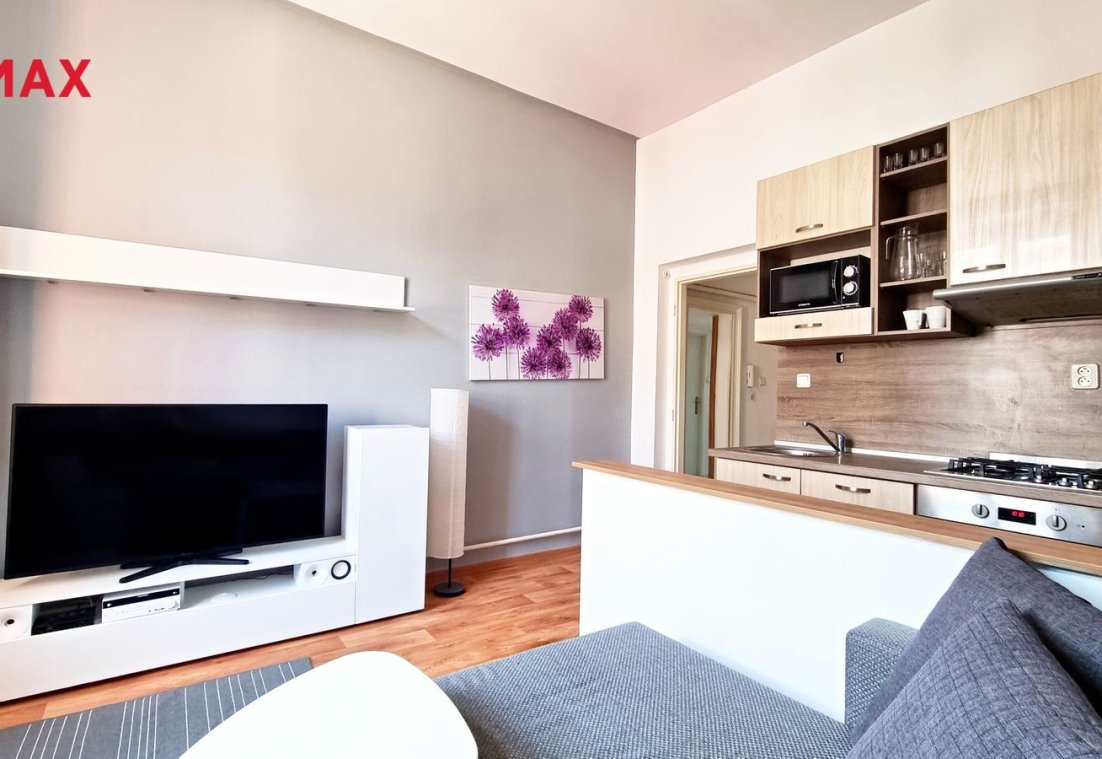 Byt disponuje obývacím pokojem s pohodlným gaučem, velkou TV, HiFi sestavou. Je zde také internetový router. Internet je v ceně nájmu. Součástí obýváku je kuchyňská linka, která je vybavena plynovým sporákem s troubou, digestoří, mikrovlnnou troubou, myčkou nádobí a lednicí. Nechybí také potřebné kuchyňské nádobí.