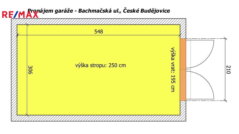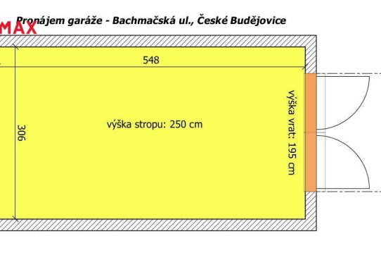 Rozměry garáže (d x š ): 5,48 x 3,06 m. Světlá výška: 2,50 m. Rozměry vrat (š x v): 2,10 x 1,95 m.
