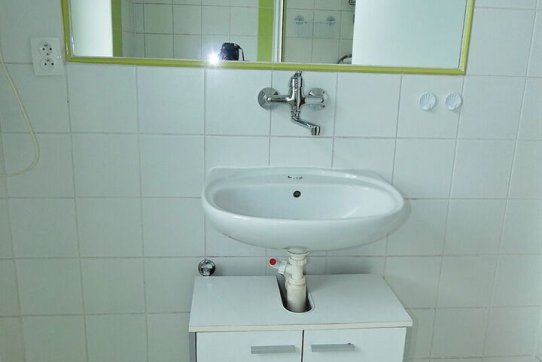 Koupelna je zděná, osazená sprchovým koutem, umyvadlem, WC a místem pro zapojení pračky.