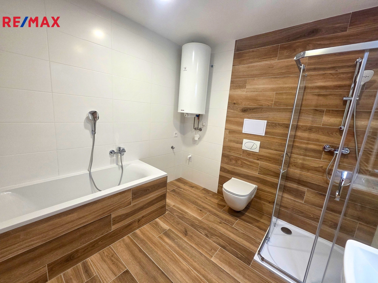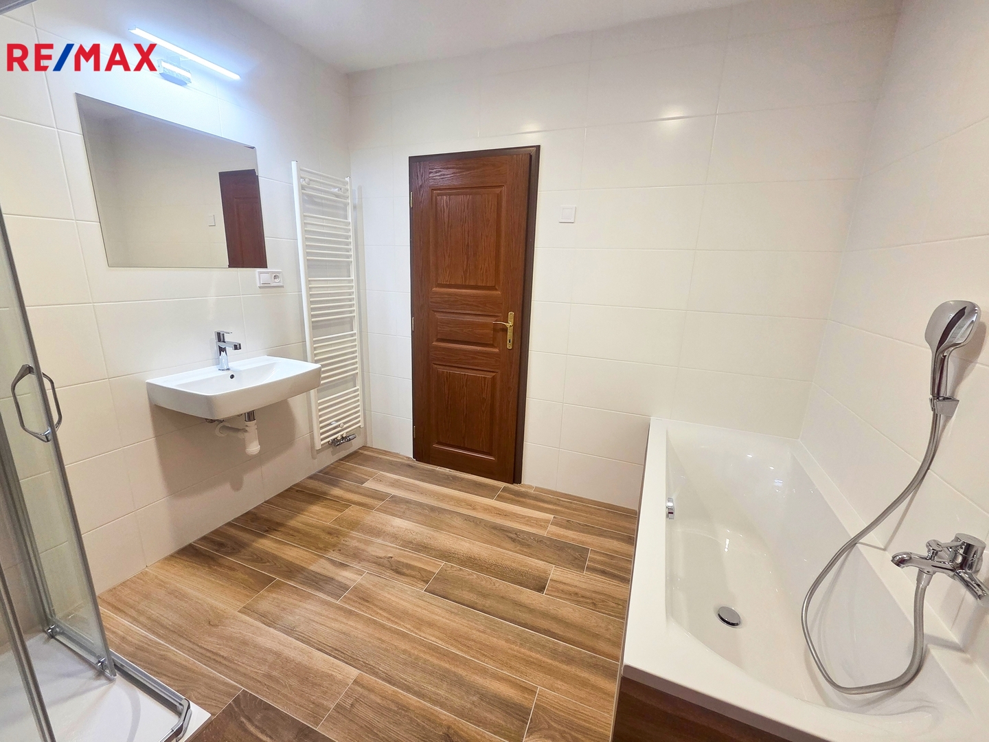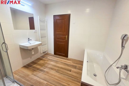 V bytě je nově zrekonstruovaná koupelna (7 m2) s vanou, sprchovým koutem, umyvadlem se zrcadlem, WC, otopným žebříkem a bojlerem. Dále se zde nachází umývárna s druhým WC.