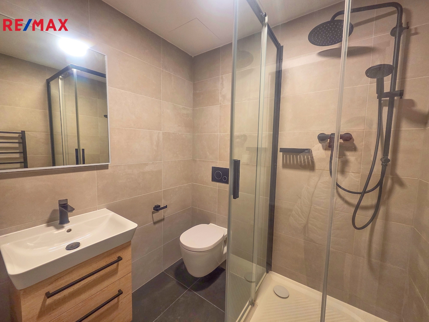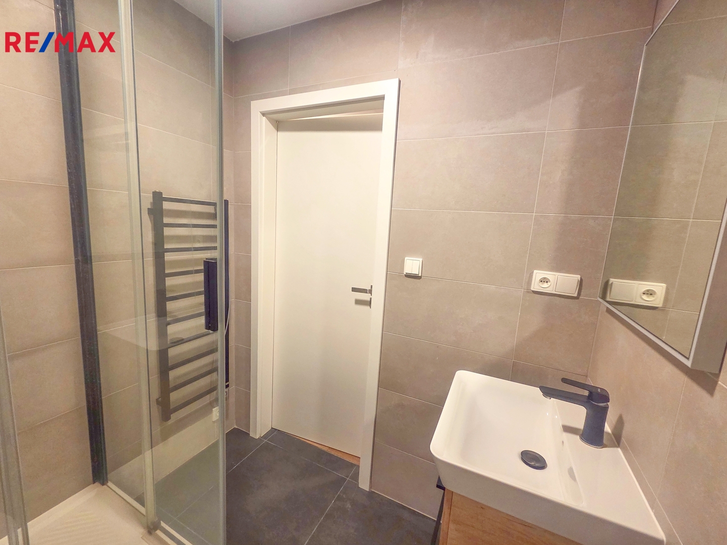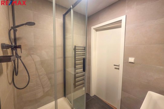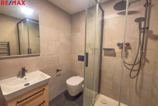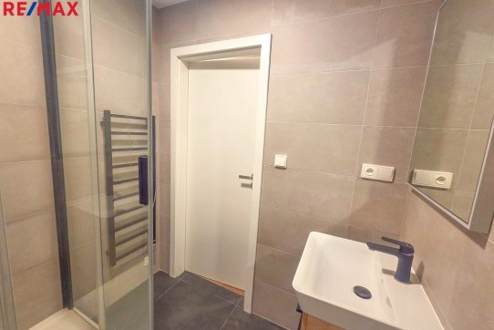 Koupelna má plochu 4,8 m2 a je osazena sprchovým koutem, umyvadlem, otopným žebříkem a WC.