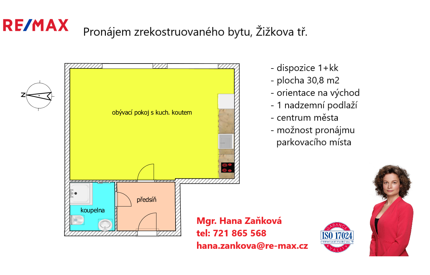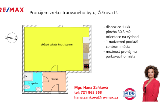 Nabízíme k pronájmu zrekonstruovaný byt 1+kk, umístěný v 1 NP multifunkční budovy s výtahem v žádané lokalitě v blízkosti centra města v ulici Žižkova.