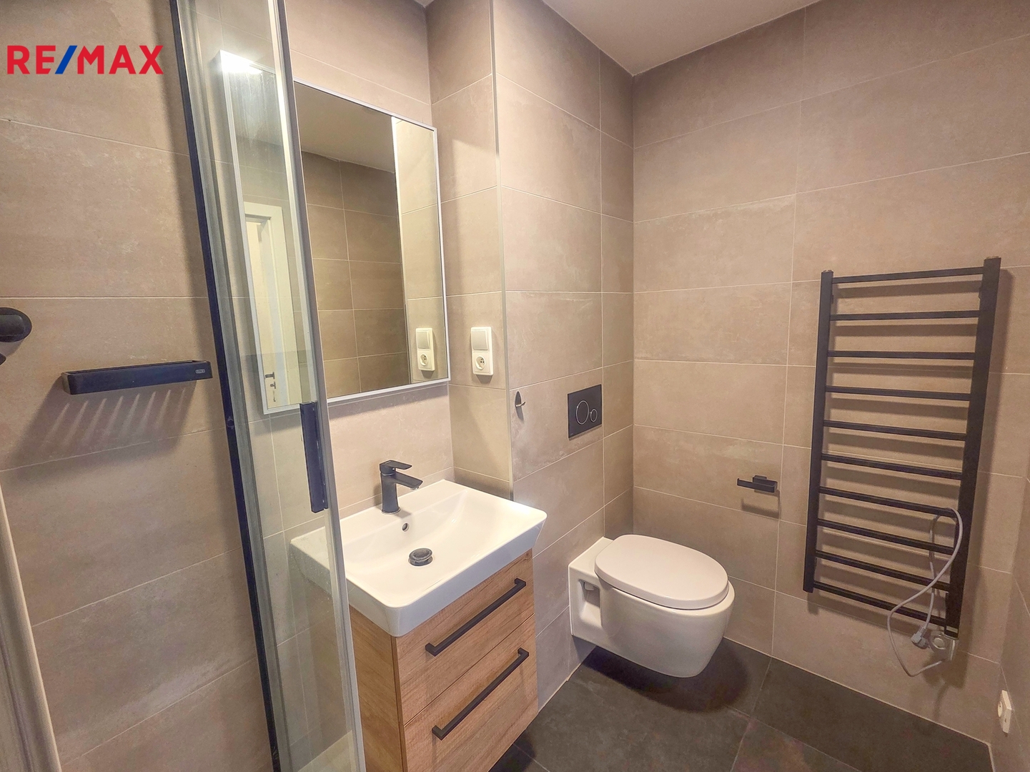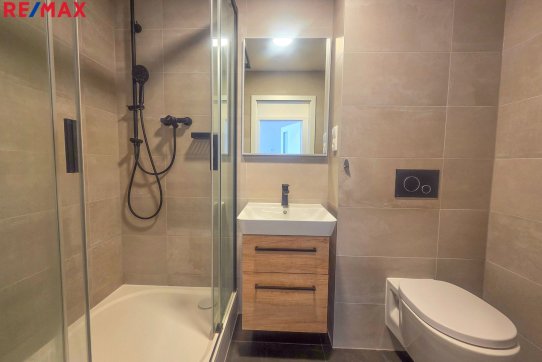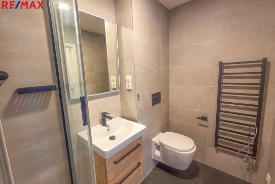 Koupelna má plochu 3 m2 a je osazena sprchovým koutem, umyvadlem, otopným žebříkem a WC.