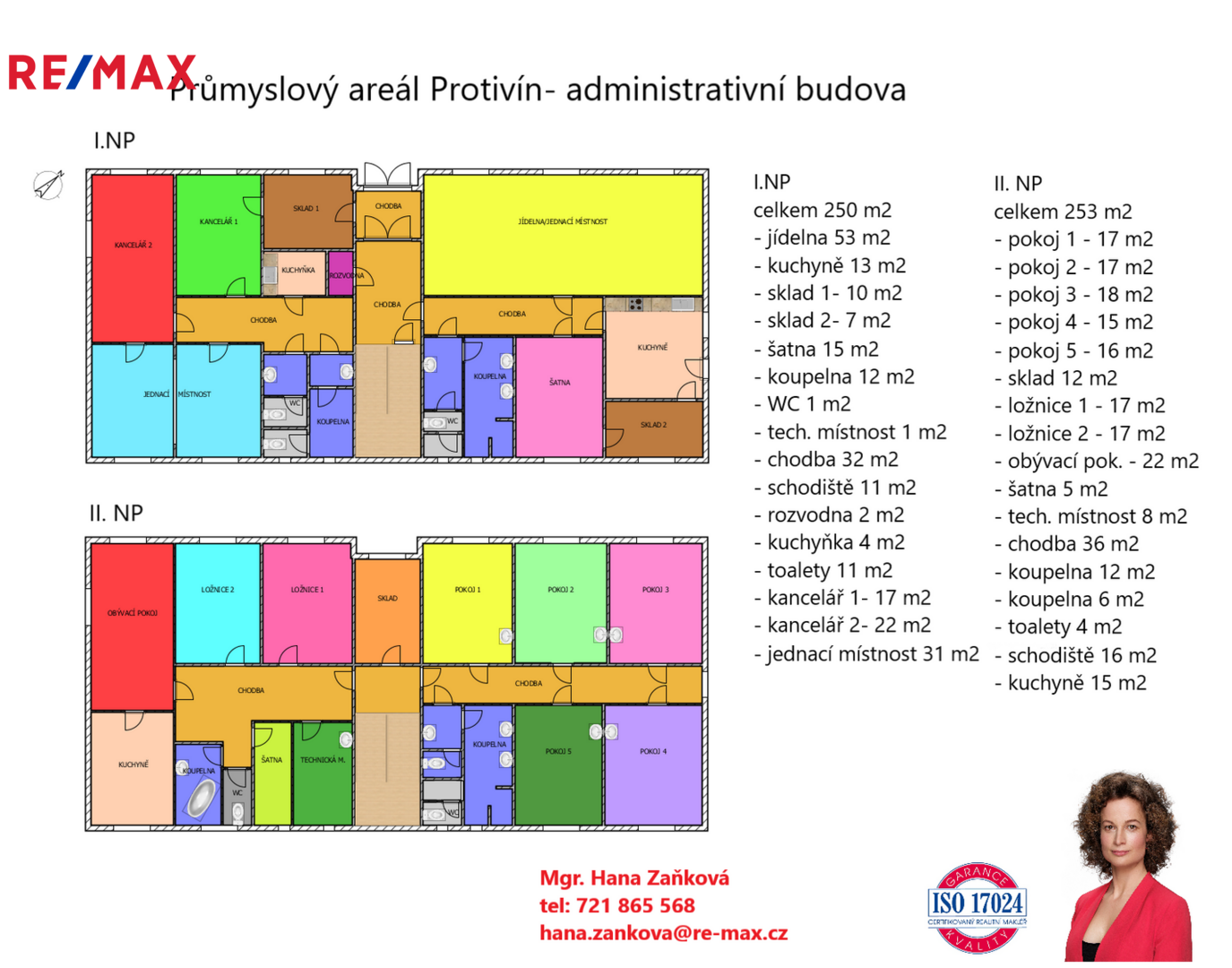 A. - dvoupodlažní budovy (užitná plocha 503 m2) se zázemím pro administrativu včetně stravovací, ubytovací a skladovací kapacity. V prvním podlaží se nachází 3 kanceláře, 2 sklady, jídelna/jednací místnost, 2 kuchyně, převlékárna, toalety pánské/dámské, koupelna. V druhém podlaží je 9 místností, které lze využít jako kanceláře či ubytování, dále se zde nachází koupelny a sociální zařízení, technická místnost, kuchyně. Dříve 2NP sloužilo jako ubytovna zaměstnanců a byt správce areálu. Budova je zděná, plastová okna, vytápěna plynem, napojena na elektřinu, kanalizaci a vodu, přípojka telefonu- Cetin, internet.