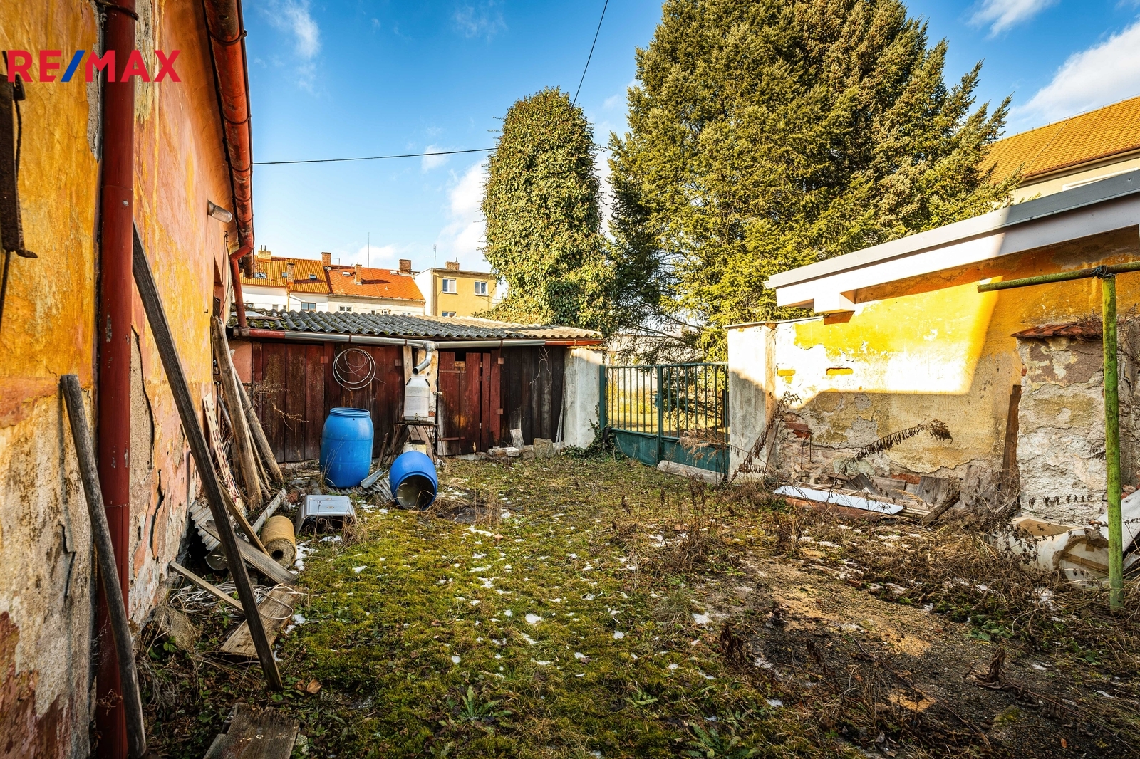 V zadní části pozemku stojí původní stavba nepodsklepeného domu se zvláštním č.p., která je ve velmi špatném technickém stavu, určena k demolici. Na ní navazují dřevěné přístřešky (kolny). Na zadní část pozemku je zvláštním povolením umožněn přístup přes pozemek ve vlastnictví města Č.B.