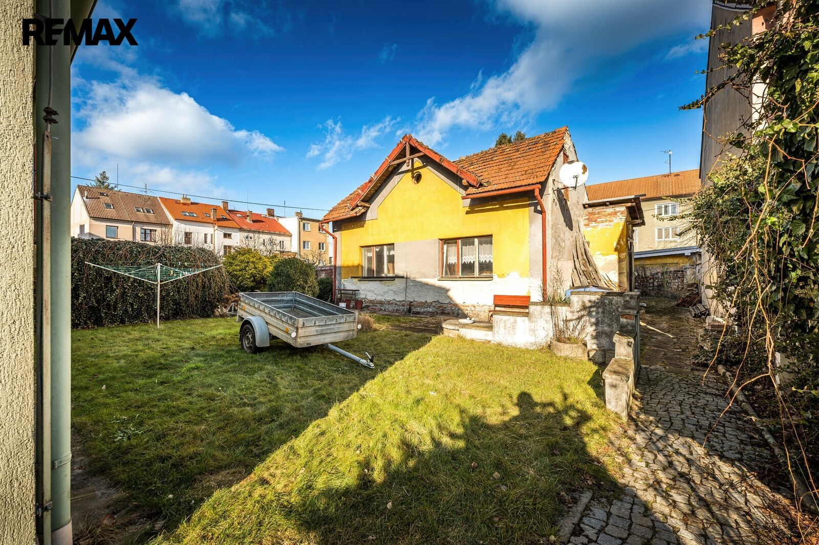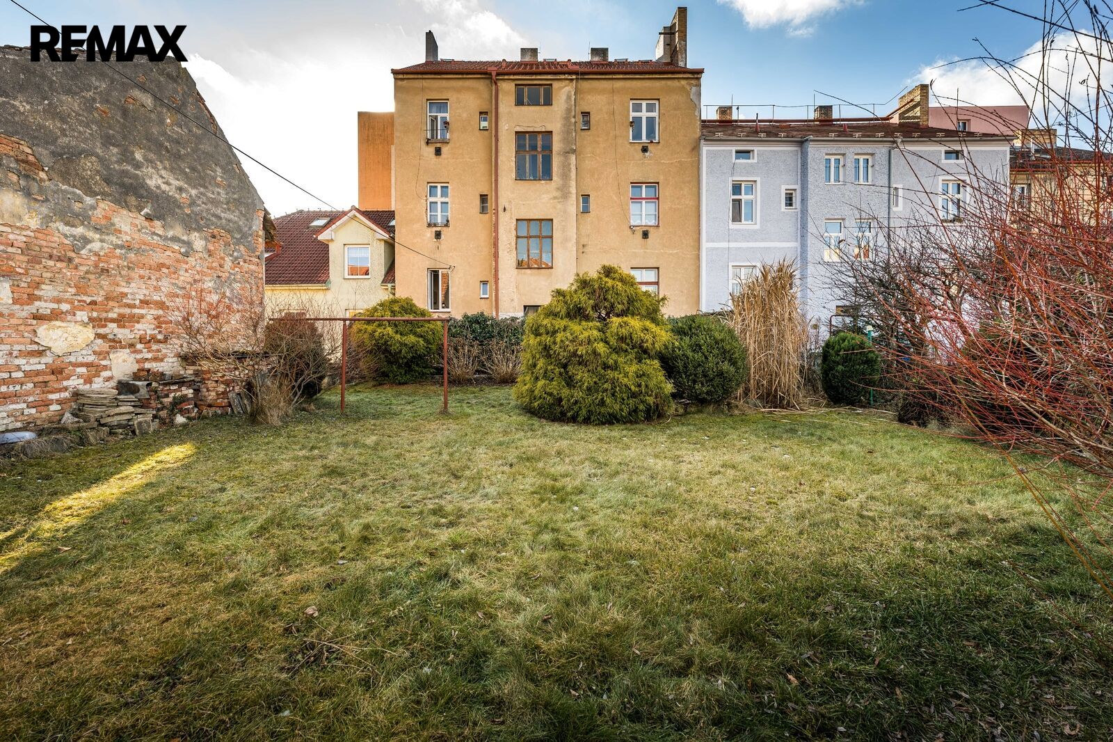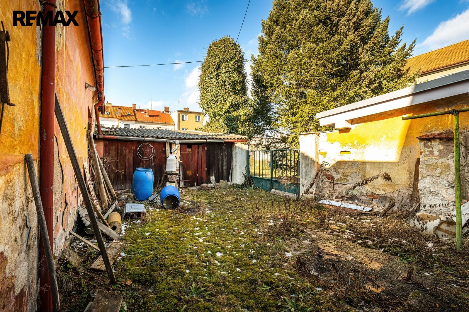 V zadní části pozemku stojí původní stavba nepodsklepeného domu se zvláštním č.p., která je ve velmi špatném technickém stavu, určena k demolici. Na ní navazují dřevěné přístřešky (kolny). Na zadní část pozemku je zvláštním povolením umožněn přístup přes pozemek ve vlastnictví města Č.B.