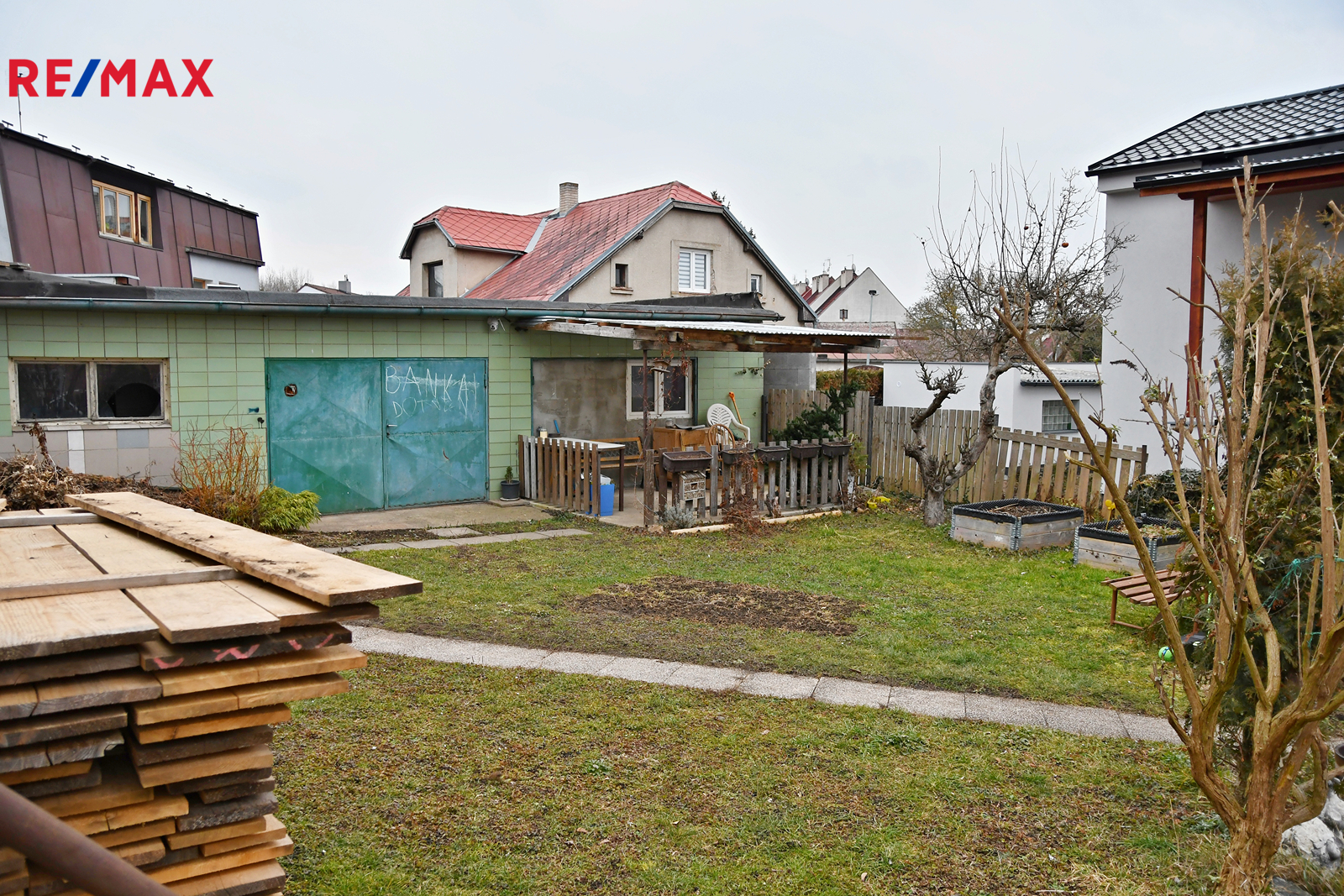 Zahrada je dostatečně prostorná i pro parkování dvou aut, pozemek je rovný a nachází se na něm garáž - velký zahradní domek.
