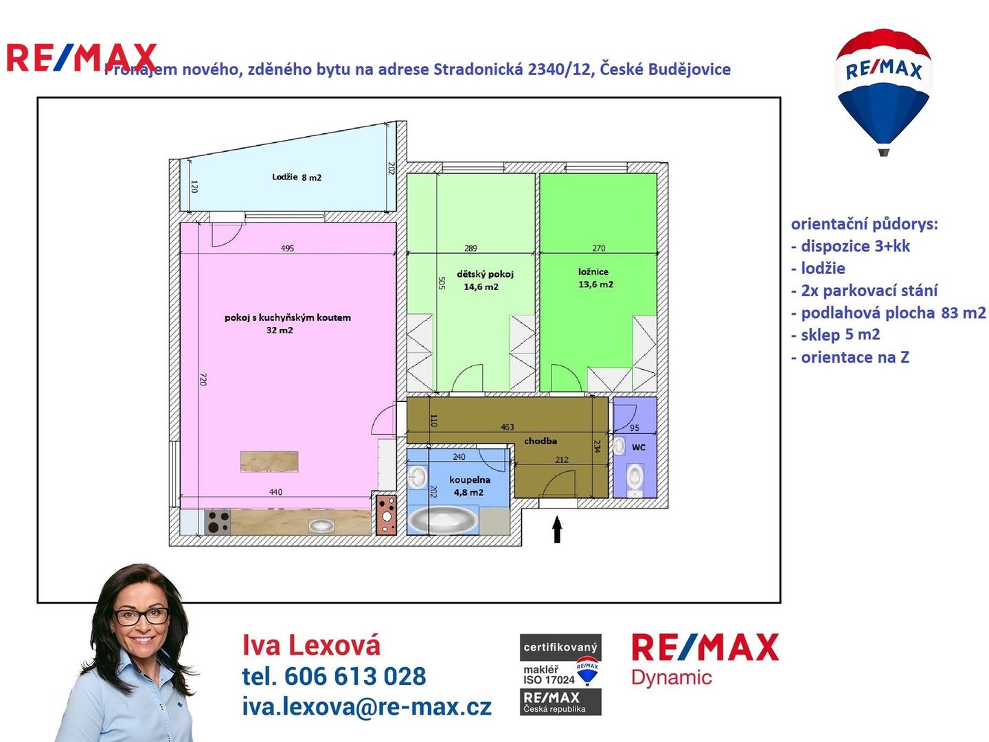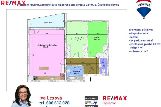 Podlahová plocha bytu je 83 m2 + lodžie 8 m2 + sklep 5 m2. Byt je dispozičně řešený jako 3+kk a sestává se z předsíně, obývacího pokoje s kuchyňským koutem se vstupem na lodžii, ložnice, dětského pokoje, koupelny s vanou a samostatného WC. Orientován je na jih a západ. Dispozici bytu s rozměry jednotlivých místností najdete na přiloženém orientačním půdorysu.