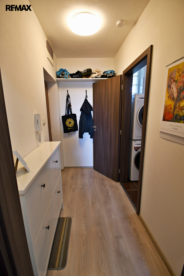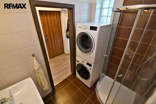 Byt je kompletně zařízený – kuchyňská linka se spotřebiči (lednice s mrazákem, varná deska, trouba, mikrovlnka, myčka nádobí), pračka, sušička, sedačka, postel, skříně i pracovní koutek.