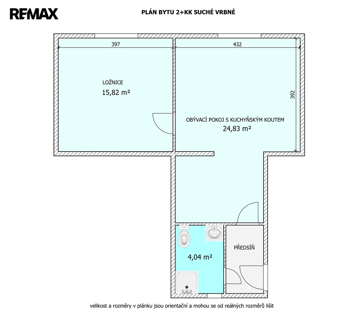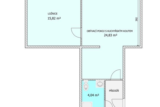 Obývací pokoj s kuchyňským koutem, ložnice, koupelna, samostatné WC a prostorná předsíň.