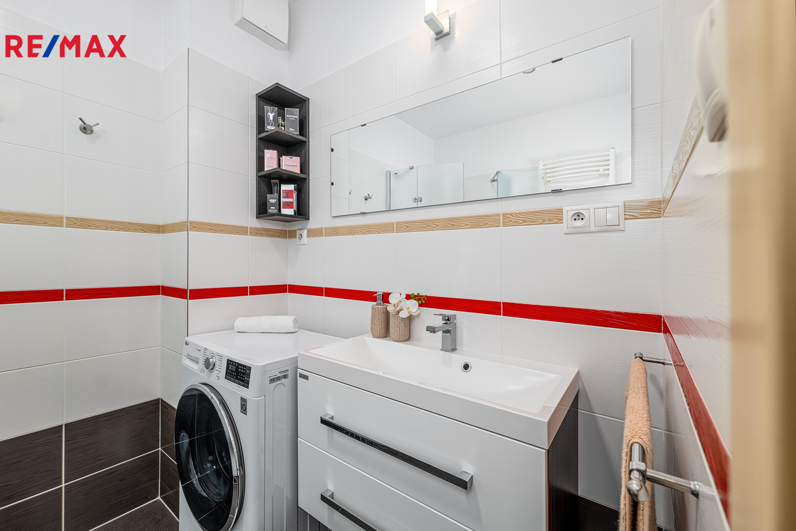 V bytě je nově instalována klimatizační jednotka a solární rolety na střešních oknech v obývacím pokoji. Pronajímá se vybavený kuchyňskou linkou se spotřebiči (myčka nádobí, trouba a indukční varná deska), vestavěnými šatními skříněmi v ložnici i chodbě, jídelním stolem a židlemi v obývacím pokoji, tv stolkem. V oknech jsou rolety nebo předokenní žaluzie.