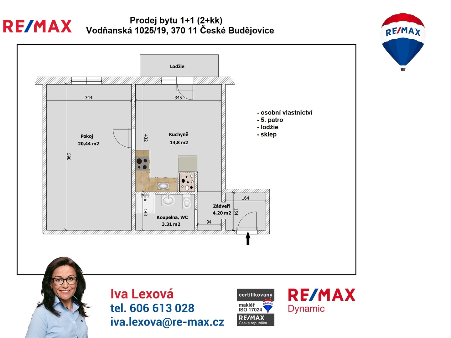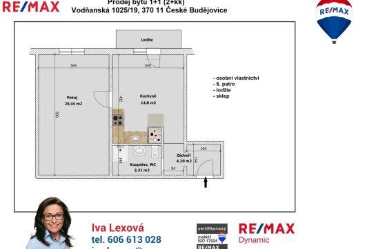 Byt v osobním vlastnictví o celkové ploše 48,3 m² (podlahová plocha bytu 42,75 m², lodžie 4,6 m² a sklep 1 m²) se nachází v 5. patře revitalizovaného, panelového domu s výtahem. Byt prošel před několika lety rekonstrukcí (vyzděná koupelna, výměna kuchyňské linky, dveří a podlahových krytin). Před dvěma lety byly vybudovány nové lodžie v celém domě.