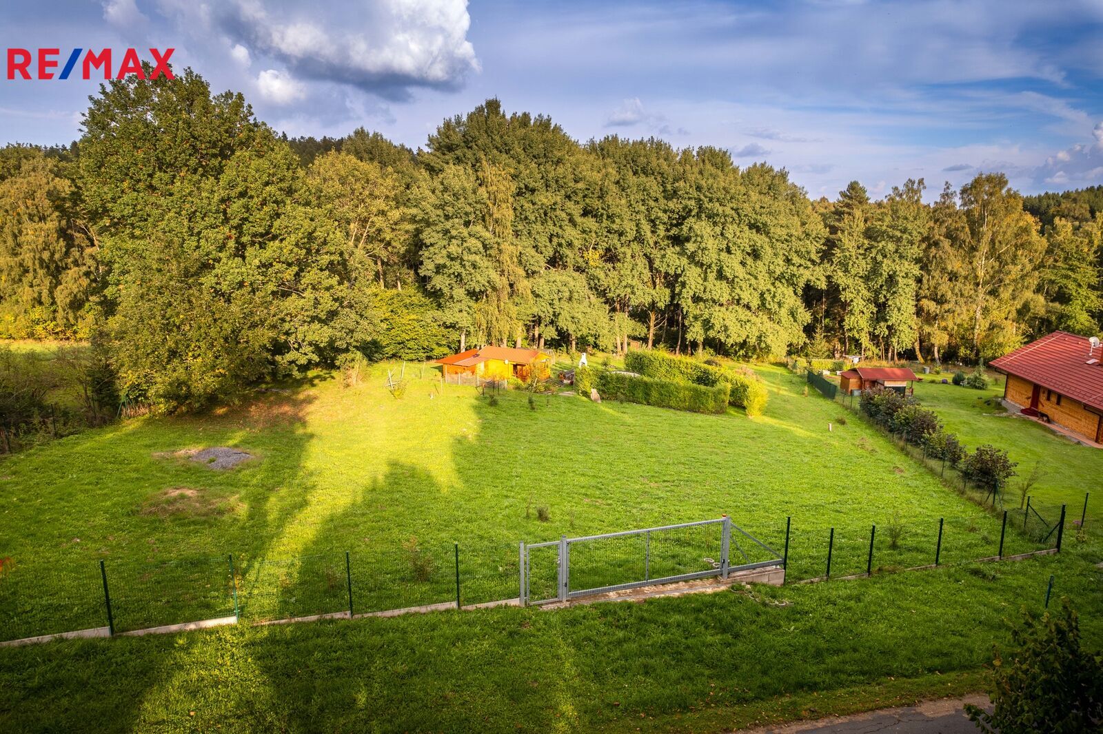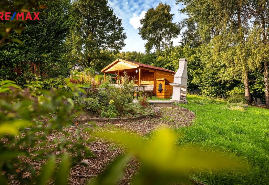 Na pozemku stojí menší dřevěná chatka, kterou lze využívat pro zázemí během pobytu nebo budoucí výstavby. Součástí je také přístřešek na nářadí. Upravená část zahrady nabízí venkovní posezení s krbem, bazénem a okrasnou výsadbou, zaručující soukromí na části rozlehlého pozemku.